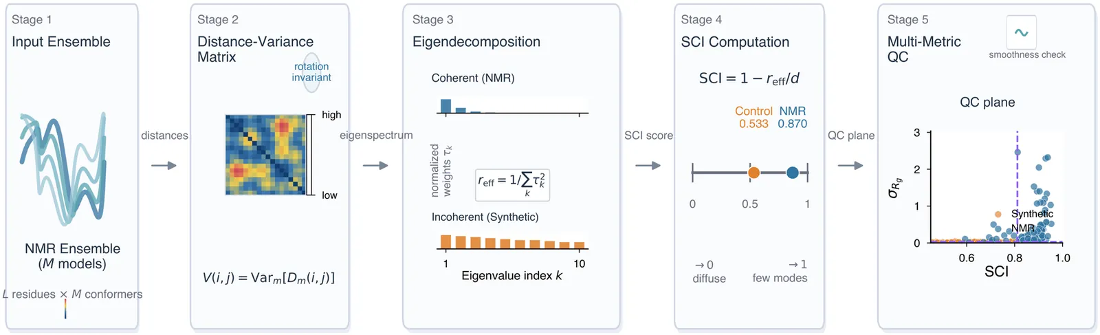 Protein structural ensembles from NMR spectroscopy capture biologically important conformational heterogeneity, but it remains difficult to determine whether observed variation reflects coordinated motion or noise-like artifacts. We evaluate the Spectral Coherence Index (SCI), a model-free, rotation-invariant summary derived from the participation-ratio effective rank of the inter-model pairwise distance-variance matrix. Under grouped primary analysis of a Main110 cohort of 110 NMR ensembles (30--403 residues; 10--30 models per entry), SCI separated experimental ensembles from matched synthetic incoherent controls with AUC-ROC $= 0.973$ and Cliff's $δ= -0.945$. Relative to an internal 27-protein pilot, discrimination softened modestly, showing that pilot-era thresholds do not transfer perfectly to a larger, more heterogeneous cohort: the primary operating point $τ= 0.811$ yielded 95.5\% sensitivity and 89.1\% specificity. PDB-level sensitivity remained nearly unchanged (AUC $= 0.972$), and an independent 11-protein holdout reached AUC $= 0.983$. Across 5-fold grouped stratified cross-validation and leave-one-function-class-out testing, SCI remained strong (AUC $= 0.968$ and $0.971$), although $σ_{R_g}$ was the stronger single-feature discriminator and a QC-augmented multifeature model generalized best (AUC $= 0.989$ and $0.990$). Residue-level validation linked SCI-derived contributions to experimental RMSF across 110 proteins and showed broad concordance with GNM-based flexibility patterns. Rescue analyses showed that Main110 softening arose mainly from size and ensemble normalization rather than from loss of spectral signal. Together, these results establish SCI as an interpretable, bounded coherence summary that is most useful when embedded in a multimetric QC workflow for heterogeneous protein ensembles.