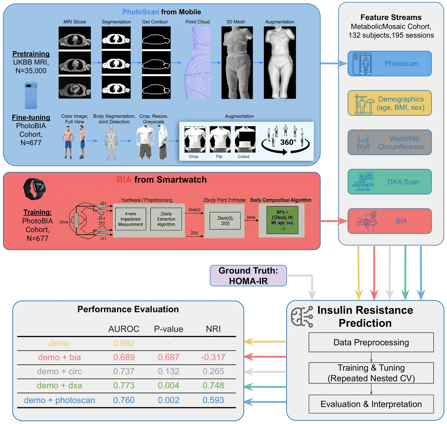 Body Mass Index (BMI) is a widely accessible but imprecise proxy of cardiometabolic health. While assessing true body composition is superior, gold-standard methods like Dual-Energy X-ray Absorptiometry (DXA) are not scalable. We address this gap by developing and validating "PhotoScan," a method to estimate body composition from smartphone imagery. We pretrained a deep learning model on UK Biobank participants (N=35,323) and fine-tuned on a newly recruited clinical cohort (PhotoBIA cohort, N=677) with diverse ethnicity, age, and body fat distribution, achieving high accuracy against DXA for total body fat percentage (BF%, MAE = 2.15%), Android-to-Gynoid fat ratio (A/G, MAE = 0.11), and visceral-to-subcutaneous fat area ratio (V/S, MAE = 0.09). Generalizability of the model was demonstrated on an independent metabolic health study cohort (MetabolicMosaic cohort, N=132 participants), achieving MAEs of 2.13% for BF%, 0.09 for A/G, and 0.09 for V/S. We then evaluated the clinical utility of these metrics in the MetabolicMosaic cohort by predicting insulin resistance (IR). Adding PhotoScan-derived body composition metrics to baseline demographics model (Age, Sex, BMI) significantly improved insulin resistance classification (Area Under the Receiver Operating Characteristic Curve "AUROC" 76.0% vs 69.2%, DeLong test p=0.002, Net Reclassification Index "NRI" 0.593). Crucially, this accessible smartphone method achieved performance nearly equivalent to adding clinical-grade DXA data to baseline demographics model (AUROC 77.3% vs 69.2%, DeLong test p=0.004, NRI 0.748). These findings demonstrate that smartphone-based phenotyping captures clinically meaningful risk signals missed by BMI and anthropometrics, offering a scalable alternative to DXA for cardiometabolic risk stratification.