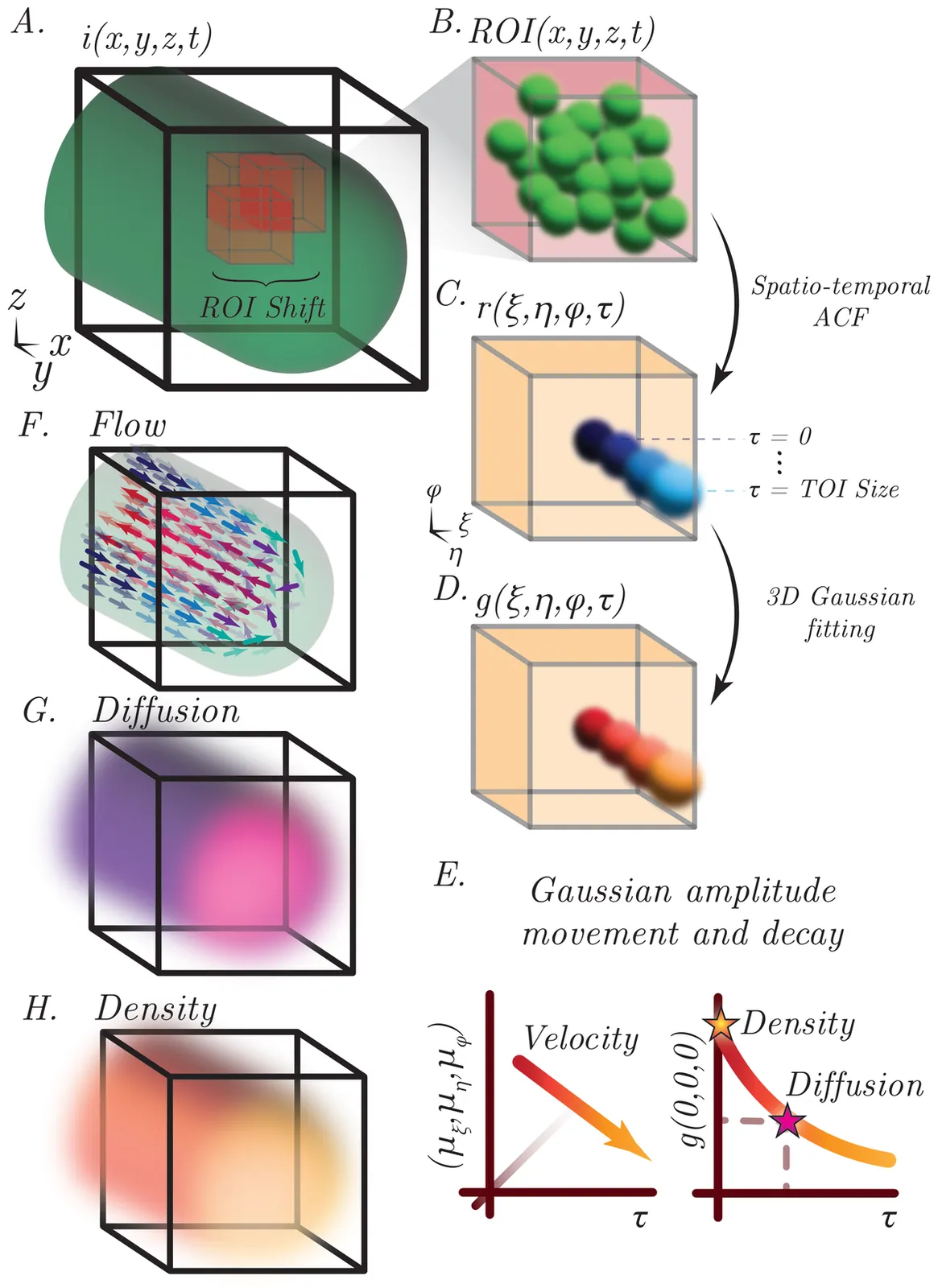 Quantitatively mapping three-dimensional (3D) flow, diffusion, and particle density in crowded living cells remains challenging because most dynamic optical microscopy measurements are effectively planar and existing analysis methods struggle with dense, noisy volumetric data. We introduce volumetric spatio-temporal image correlation spectroscopy (vSTICS), a framework that recovers voxel-resolved flow, diffusion coefficients, and particle densities from 3D fluorescence time series. Growing Camellia japonica pollen tubes were imaged with field-synthesis lattice light-sheet microscopy, and localized 3D spatio-temporal correlation analysis was applied to overlapping volumetric samples to generate maps of velocity, diffusion, and density. Validation with synthetic flow-diffusion simulations showed accurate recovery of seeded transport parameters, including velocities near $3$ $μ$m s$^{-1}$ and diffusion near $10^{-3}$ $μ$m$^2$ s$^{-1}$. Fluorescent microsphere experiments verified particle number and point spread function readouts and measured diffusion coefficients of $0.3 \pm 0.1$ $μ$m$^2$ s$^{-1}$ in gel, consistent with imaging-FCS measurements of $0.5 \pm 0.2$ $μ$m$^2$ s$^{-1}$. Applied to mitochondria in pollen tubes, vSTICS resolved a bidirectional reverse-fountain pattern with slower anterograde transport ($0.1$-$1$ $μ$m s$^{-1}$) and faster retrograde motion peaking near $3$ $μ$m s$^{-1}$, plus a retrograde corridor about $2$ $μ$m wide. Density and diffusion maps indicated a denser, more advective core and higher peripheral diffusion. High-density sub-diffraction vesicle mapping produced similar velocity landscapes with about ten-fold higher particle densities. These results establish vSTICS as a practical method for quantitative 3D mapping of intracellular transport and refines the reverse-fountain model by revealing asymmetric, predominantly transverse circulation.