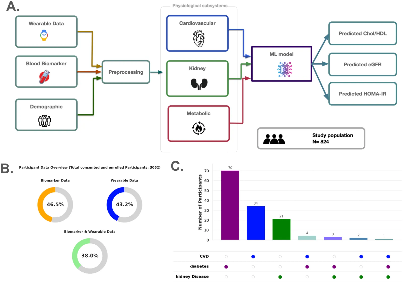 Cardiovascular-Kidney-Metabolic (CKM) syndrome represents a growing public health crisis, yet the subclinical heterogeneity of its component systems remains underexplored. Early detection of physiological deviation is critical for preventing irreversible organ damage and mortality. Here, we characterize the prevalence and interplay of CKM impairment in a US cohort (N=841) by integrating continuous wearable data with clinical biomarkers. We assessed cardiovascular, kidney via clinical biomarkers, namely Chol/HDL, eGFR, as well as metabolic health risk through Homeostatic Model Assessment of Insulin Resistance (HOMA-IR). We show that while metabolic and cardiovascular disruptions are significantly associated (r=0.26, p<0.001), early-stage kidney impairment manifests independently. Utilizing a normalized deviance score, we identified significant health impairments in 29.0% of the cohort. Cardiovascular deviation was the most prevalent singular phenotype (13.3%), followed by metabolic (9.1%) and renal (6.25%) deviations, with dual metabolic-cardiovascular impairment occurring in only 2.2% of participants. These findings suggest that high system-specific deviance may serve as an indicator for accelerated physiological aging within the respective organ system. Furthermore, feature ablation analysis revealed that step count, Active Zone Minutes, and resting heart rate are the most potent wearable-derived predictors of cardiovascular and metabolic decline. These findings underscore the necessity of a multi-system subtyping approach, demonstrating that wearable-derived phenotypes can facilitate the early, targeted interventions required to manage the complex landscape of CKM syndrome.