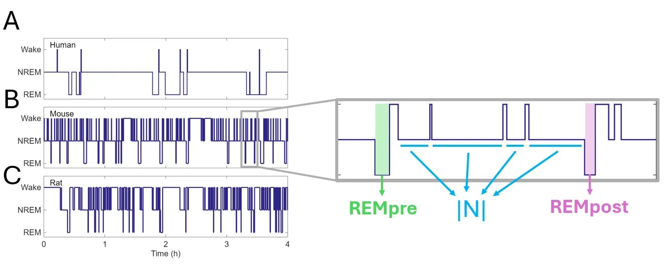 Mammalian sleep is characterized by multiple alternations between episodes of rapid-eye-movement sleep (REMS) and non-REM sleep (NREMS). While the mechanisms governing the timing of these ultradian NREMS-REMS cycles remain poorly understood, the phenomenon of REMS pressure, namely a drive for REMS that builds up between REMS episodes, is thought to be a contributing factor. Prior analyses of NREMS-REMS cycles in mice has suggested that time in NREMS is a primary contributor to REMS pressure. Building on that finding, we previously introduced a REMS propensity measure defined as the probability to enter REMS before the accumulation of an additional amount of NREMS. Analyzing mouse ultradian cycle data, we showed that REMS propensity at REMS onset was positively correlated with REMS bout duration and with the probability of the occurrence of a REMS bout followed by a short inter-REMS interval, called a sequential REMS cycle. In this paper, we extend our analyses of REMS propensity to human and rat ultradian NREMS-REMS cycle data. We show that, as in mice, human and rat sleep contain both short NREMS-REMS sequential cycles and longer single NREMS-REMS cycles, though there are some differences in the relative distributions of cycle durations. Although rodents exhibit polyphasic sleep in contrast with the consolidated sleep of humans, the calculated REMS propensity measures in all three species show similar profiles as functions of time spent in NREMS: specifically, REMS propensity increases with time spent in NREMS until it reaches a peak value, and then it decays with additional time in NREMS. Positive correlations of REMS propensity at REMS onset with REMS bout duration were present in both human and rat data as in mouse data, suggesting that time spent in NREMS also influences REMS duration in these species.