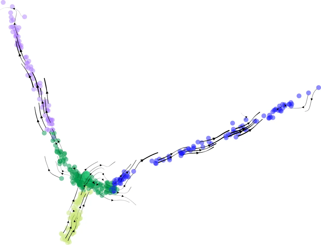 Trajectory inference is a critical problem in single-cell transcriptomics, which aims to reconstruct the dynamic process underlying a population of cells from sequencing data. Of particular interest is the reconstruction of differentiation trees. One way of doing this is by estimating the path distance between nodes -- labeled by cells -- based on cell similarities observed in the sequencing data. Recent sequencing techniques make it possible to measure two types of data: gene expression levels, and RNA velocity, a vector that quantifies variation in gene expression. The sequencing data then consist in a discrete vector field in dimension the number of genes of interest. In this article, we present a novel method for inferring differentiation trees from RNA velocity fields using a distance-based approach. In particular, we introduce a cell dissimilarity measure defined as the squared varifold distance between the integral curves of the RNA velocity field, which we show is a robust estimate of the path distance on the target differentiation tree. Upstream of the dissimilarity measure calculation, we also implement comprehensive routines for the preprocessing and integration of the RNA velocity field. Finally, we illustrate the ability of our method to recover differentiation trees with high accuracy on several simulated and real datasets, and compare these results with the state of the art.