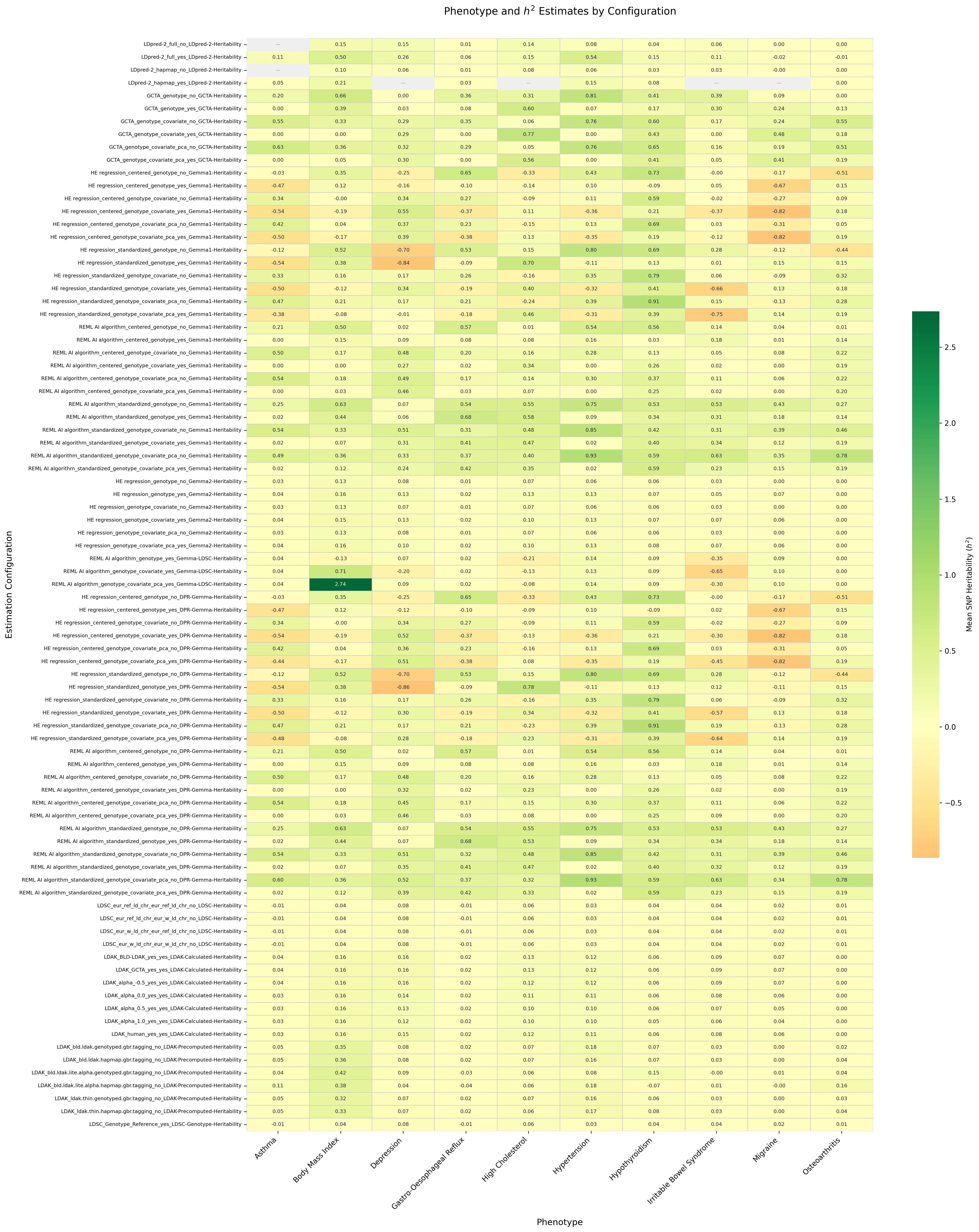 Objective: SNP heritability estimates vary substantially across estimation strategies, yet the downstream consequences for polygenic risk score (PRS) construction remain poorly characterised. We systematically benchmarked heritability estimation configurations and assessed their propagation into downstream PRS performance. Methods: We benchmarked 86 heritability-estimation configurations spanning six tool families (GEMMA, GCTA, LDAK, DPR, LDSC, and SumHer) and ten method groups across 10 UK Biobank phenotypes, yielding 844 configuration-level estimates. Each estimate was propagated into GCTA-SBLUP and LDpred2-lassosum2 PRS frameworks and evaluated across five cross-validation folds using null, PRS-only, and full models. Eleven binary analytical contrasts were tested using Mann-Whitney U tests to identify drivers of heritability variability. Results: Heritability ranged from -0.862 to 2.735 (mean = 0.134, SD = 0.284), with 133 of 844 estimates (15.8%) being negative and concentrated in unconstrained estimation regimes. Ten of eleven analytical contrasts significantly affected heritability magnitude, with algorithm choice and GRM standardisation showing the largest effects. Despite this upstream variability, downstream PRS test performance was only weakly coupled to heritability magnitude: pooled Pearson correlations between h^2 and test AUC were r = -0.023 for GCTA-SBLUP and r = +0.014 for LDpred2-lassosum2, with both being non-significant. Conclusion: SNP heritability is best interpreted as a configuration-sensitive modelling parameter rather than a universally stable scalar input. Heritability estimates should always be reported alongside their full estimation specification, and downstream PRS performance is comparatively robust to moderate variation in the heritability input.