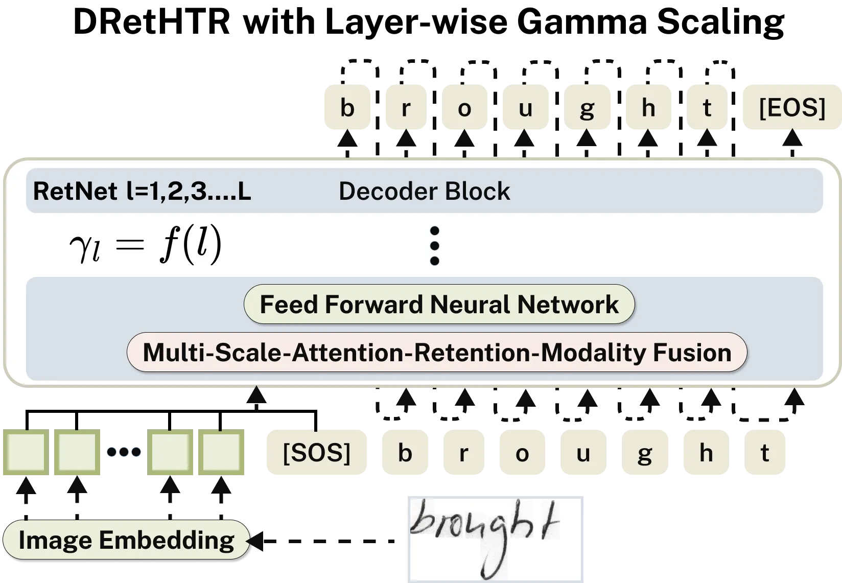 State-of-the-art handwritten text recognition (HTR) systems commonly use Transformers, whose growing key-value (KV) cache makes decoding slow and memory-intensive. We introduce DRetHTR, a decoder-only model built on Retentive Networks (RetNet). Compared to an equally sized decoder-only Transformer baseline, DRetHTR delivers 1.6-1.9x faster inference with 38-42% less memory usage, without loss of accuracy. By replacing softmax attention with softmax-free retention and injecting multi-scale sequential priors, DRetHTR avoids a growing KV cache: decoding is linear in output length in both time and memory. To recover the local-to-global inductive bias of attention, we propose layer-wise gamma scaling, which progressively enlarges the effective retention horizon in deeper layers. This encourages early layers to model short-range dependencies and later layers to capture broader context, mitigating the flexibility gap introduced by removing softmax. Consequently, DRetHTR achieves best reported test character error rates of 2.26% (IAM-A, en), 1.81% (RIMES, fr), and 3.46% (Bentham, en), and is competitive on READ-2016 (de) with 4.21%. This demonstrates that decoder-only RetNet enables Transformer-level HTR accuracy with substantially improved decoding speed and memory efficiency.