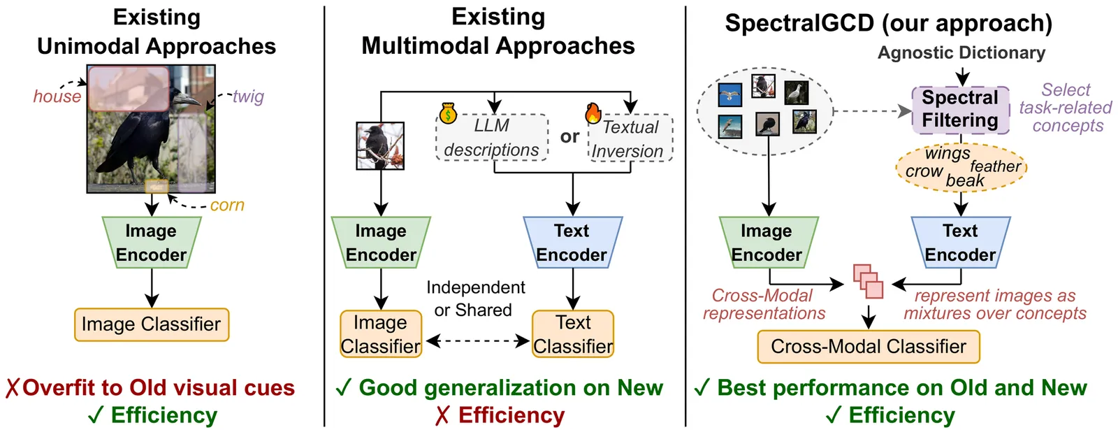 Generalized Category Discovery (GCD) aims to identify novel categories in unlabeled data while leveraging a small labeled subset of known classes. Training a parametric classifier solely on image features often leads to overfitting to old classes, and recent multimodal approaches improve performance by incorporating textual information. However, they treat modalities independently and incur high computational cost. We propose SpectralGCD, an efficient and effective multimodal approach to GCD that uses CLIP cross-modal image-concept similarities as a unified cross-modal representation. Each image is expressed as a mixture over semantic concepts from a large task-agnostic dictionary, which anchors learning to explicit semantics and reduces reliance on spurious visual cues. To maintain the semantic quality of representations learned by an efficient student, we introduce Spectral Filtering which exploits a cross-modal covariance matrix over the softmaxed similarities measured by a strong teacher model to automatically retain only relevant concepts from the dictionary. Forward and reverse knowledge distillation from the same teacher ensures that the cross-modal representations of the student remain both semantically sufficient and well-aligned. Across six benchmarks, SpectralGCD delivers accuracy comparable to or significantly superior to state-of-the-art methods at a fraction of the computational cost. The code is publicly available at: https://github.com/miccunifi/SpectralGCD.