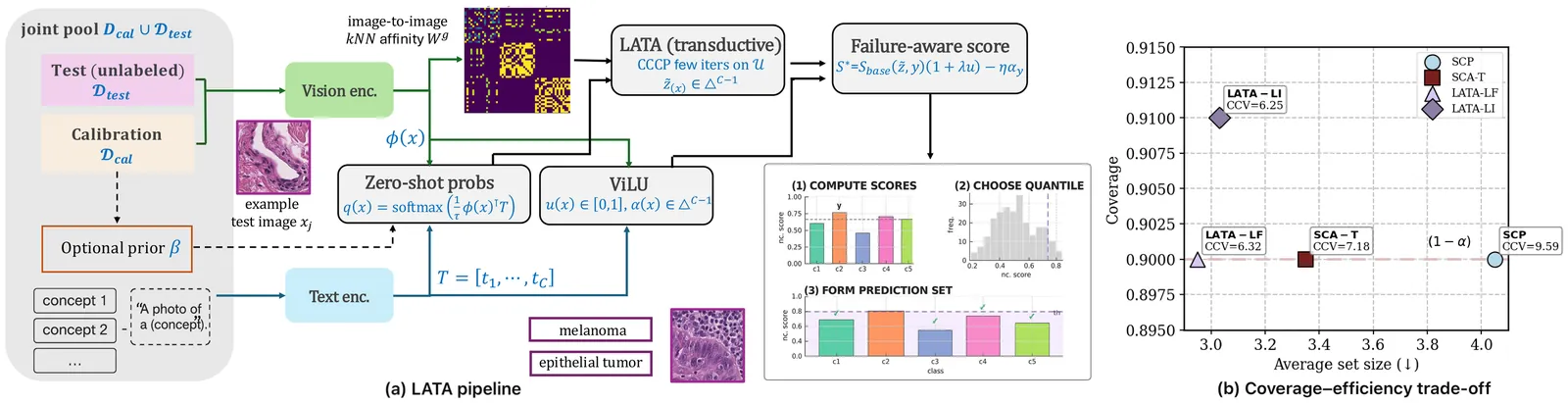 Medical vision-language models (VLMs) are strong zero-shot recognizers for medical imaging, but their reliability under domain shift hinges on calibrated uncertainty with guarantees. Split conformal prediction (SCP) offers finite-sample coverage, yet prediction sets often become large (low efficiency) and class-wise coverage unbalanced-high class-conditioned coverage gap (CCV), especially in few-shot, imbalanced regimes; moreover, naively adapting to calibration labels breaks exchangeability and voids guarantees. We propose \texttt{\textbf{LATA}} (Laplacian-Assisted Transductive Adaptation), a \textit{training- and label-free} refinement that operates on the joint calibration and test pool by smoothing zero-shot probabilities over an image-image k-NN graph using a small number of CCCP mean-field updates, preserving SCP validity via a deterministic transform. We further introduce a \textit{failure-aware} conformal score that plugs into the vision-language uncertainty (ViLU) framework, providing instance-level difficulty and label plausibility to improve prediction set efficiency and class-wise balance at fixed coverage. \texttt{\textbf{LATA}} is black-box (no VLM updates), compute-light (windowed transduction, no backprop), and includes an optional prior knob that can run strictly label-free or, if desired, in a label-informed variant using calibration marginals once. Across \textbf{three} medical VLMs and \textbf{nine} downstream tasks, \texttt{\textbf{LATA}} consistently reduces set size and CCV while matching or tightening target coverage, outperforming prior transductive baselines and narrowing the gap to label-using methods, while using far less compute. Comprehensive ablations and qualitative analyses show that \texttt{\textbf{LATA}} sharpens zero-shot predictions without compromising exchangeability.