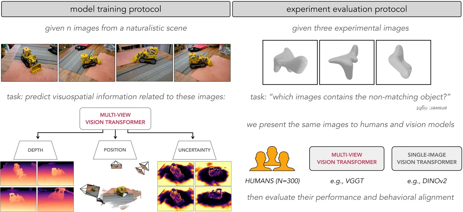Humans can infer the three-dimensional structure of objects from two-dimensional visual inputs. Modeling this ability has been a longstanding goal for the science and engineering of visual intelligence, yet decades of computational methods have fallen short of human performance. Here we develop a modeling framework that predicts human 3D shape inferences for arbitrary objects, directly from experimental stimuli. We achieve this with a novel class of neural networks trained using a visual-spatial objective over naturalistic sensory data; given a set of images taken from different locations within a natural scene, these models learn to predict spatial information related to these images, such as camera location and visual depth, without relying on any object-related inductive biases. Notably, these visual-spatial signals are analogous to sensory cues readily available to humans. We design a zero-shot evaluation approach to determine the performance of these `multi-view' models on a well established 3D perception task, then compare model and human behavior. Our modeling framework is the first to match human accuracy on 3D shape inferences, even without task-specific training or fine-tuning. Remarkably, independent readouts of model responses predict fine-grained measures of human behavior, including error patterns and reaction times, revealing a natural correspondence between model dynamics and human perception. Taken together, our findings indicate that human-level 3D perception can emerge from a simple, scalable learning objective over naturalistic visual-spatial data. All code, human behavioral data, and experimental stimuli needed to reproduce our findings can be found on our project page.