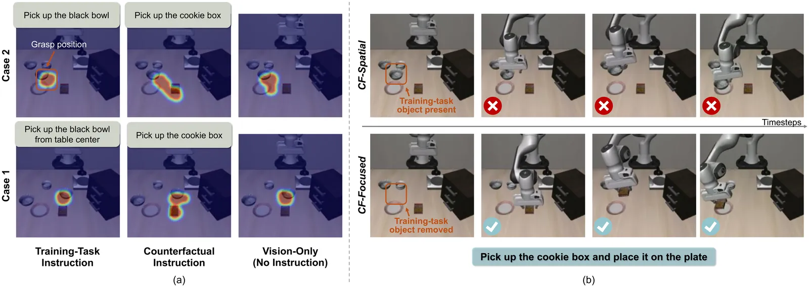 Vision-Language-Action models (VLAs) promise to ground language instructions in robot control, yet in practice often fail to faithfully follow language. When presented with instructions that lack strong scene-specific supervision, VLAs suffer from counterfactual failures: they act based on vision shortcuts induced by dataset biases, repeatedly executing well-learned behaviors and selecting objects frequently seen during training regardless of language intent. To systematically study it, we introduce LIBERO-CF, the first counterfactual benchmark for VLAs that evaluates language following capability by assigning alternative instructions under visually plausible LIBERO layouts. Our evaluation reveals that counterfactual failures are prevalent yet underexplored across state-of-the-art VLAs. We propose Counterfactual Action Guidance (CAG), a simple yet effective dual-branch inference scheme that explicitly regularizes language conditioning in VLAs. CAG combines a standard VLA policy with a language-unconditioned Vision-Action (VA) module, enabling counterfactual comparison during action selection. This design reduces reliance on visual shortcuts, improves robustness on under-observed tasks, and requires neither additional demonstrations nor modifications to existing architectures or pretrained models. Extensive experiments demonstrate its plug-and-play integration across diverse VLAs and consistent improvements. For example, on LIBERO-CF, CAG improves $π_{0.5}$ by 9.7% in language following accuracy and 3.6% in task success on under-observed tasks using a training-free strategy, with further gains of 15.5% and 8.5%, respectively, when paired with a VA model. In real-world evaluations, CAG reduces counterfactual failures of 9.4% and improves task success by 17.2% on average.