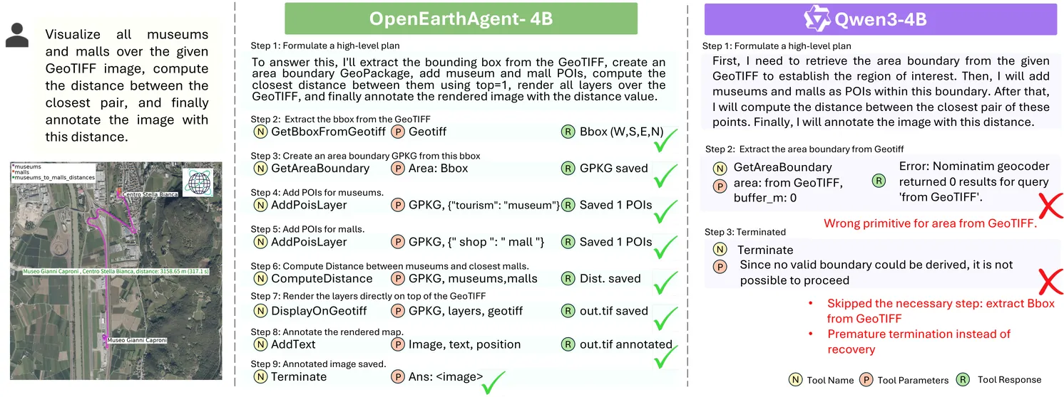 Recent progress in multimodal reasoning has enabled agents that can interpret imagery, connect it with language, and perform structured analytical tasks. Extending such capabilities to the remote sensing domain remains challenging, as models must reason over spatial scale, geographic structures, and multispectral indices while maintaining coherent multi-step logic. To bridge this gap, OpenEarthAgent introduces a unified framework for developing tool-augmented geospatial agents trained on satellite imagery, natural-language queries, and detailed reasoning traces. The training pipeline relies on supervised fine-tuning over structured reasoning trajectories, aligning the model with verified multistep tool interactions across diverse analytical contexts. The accompanying corpus comprises 14,538 training and 1,169 evaluation instances, with more than 100K reasoning steps in the training split and over 7K reasoning steps in the evaluation split. It spans urban, environmental, disaster, and infrastructure domains, and incorporates GIS-based operations alongside index analyses such as NDVI, NBR, and NDBI. Grounded in explicit reasoning traces, the learned agent demonstrates structured reasoning, stable spatial understanding, and interpretable behaviour through tool-driven geospatial interactions across diverse conditions. We report consistent improvements over a strong baseline and competitive performance relative to recent open and closed-source models.