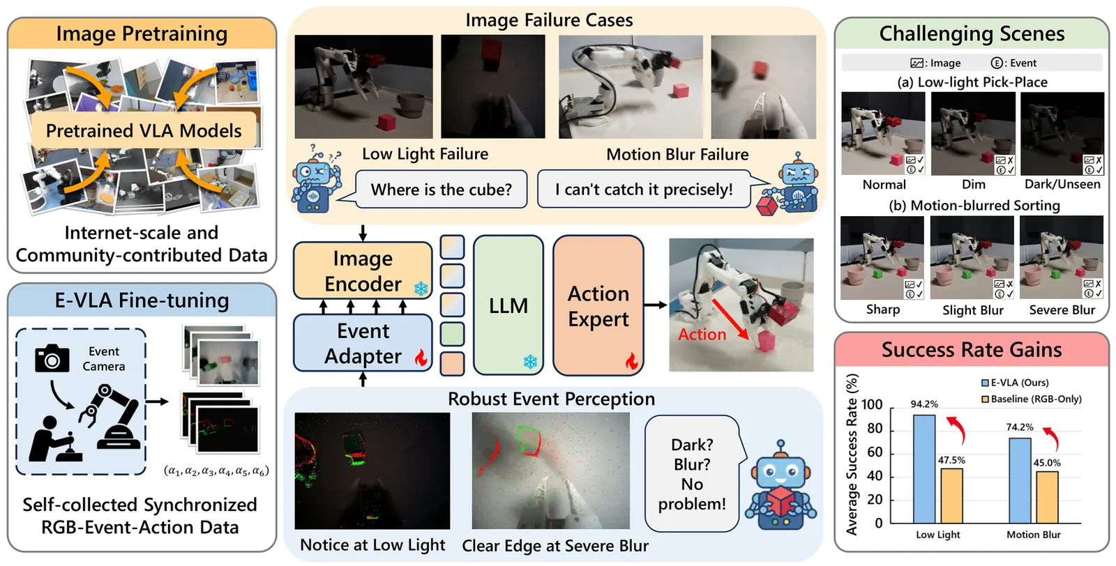 Robotic Vision-Language-Action (VLA) models generalize well for open-ended manipulation, but their perception is fragile under sensing-stage degradations such as extreme low light, motion blur, and black clipping. We present E-VLA, an event-augmented VLA framework that improves manipulation robustness when conventional frame-based vision becomes unreliable. Instead of reconstructing images from events, E-VLA directly leverages motion and structural cues in event streams to preserve semantic perception and perception-action consistency under adverse conditions. We build an open-source teleoperation platform with a DAVIS346 event camera and collect a real-world synchronized RGB-event-action manipulation dataset across diverse tasks and illumination settings. We also propose lightweight, pretrained-compatible event integration strategies and study event windowing and fusion for stable deployment. Experiments show that even a simple parameter-free fusion, i.e., overlaying accumulated event maps onto RGB images, could substantially improve robustness in dark and blur-heavy scenes: on Pick-Place at 20 lux, success increases from 0% (image-only) to 60% with overlay fusion and to 90% with our event adapter; under severe motion blur (1000 ms exposure), Pick-Place improves from 0% to 20-25%, and Sorting from 5% to 32.5%. Overall, E-VLA provides systematic evidence that event-driven perception can be effectively integrated into VLA models, pointing toward robust embodied intelligence beyond conventional frame-based imaging. Code and dataset will be available at https://github.com/JJayzee/E-VLA.