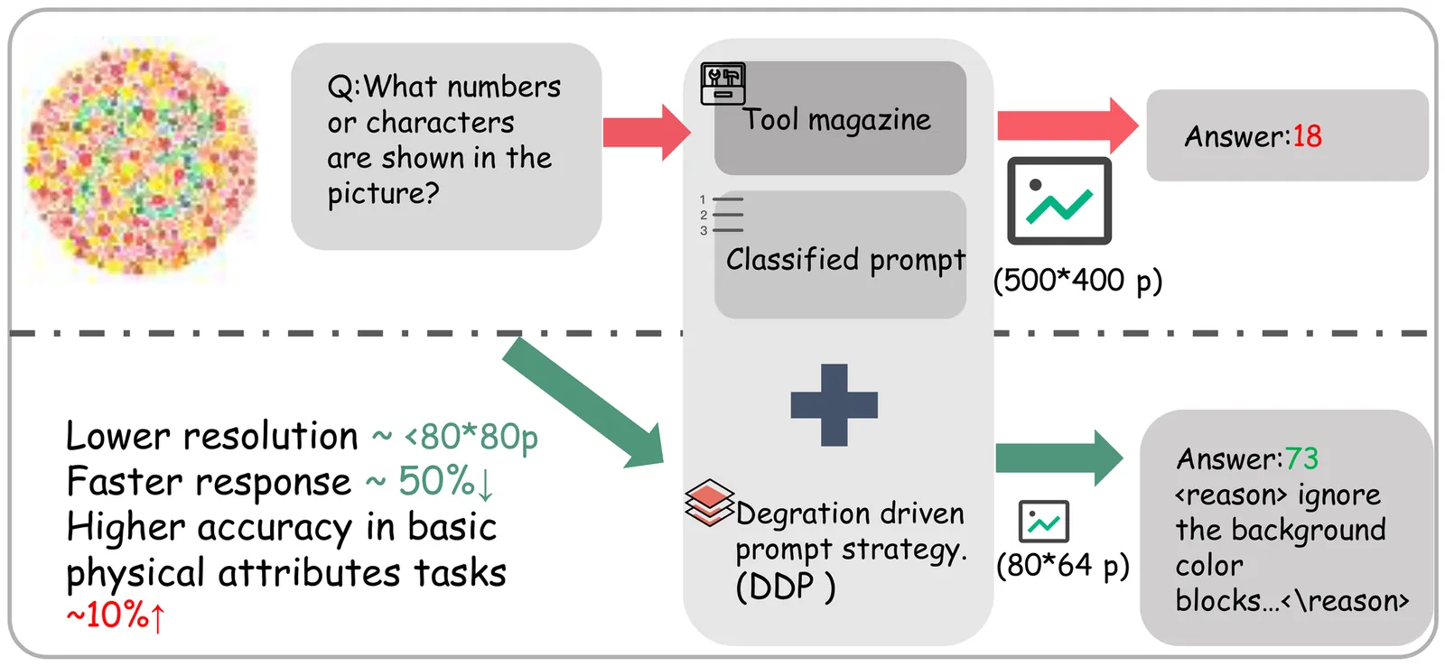 Recent advancements in Vision-Language Models (VLMs) have significantly pushed the boundaries of Visual Question Answering (VQA).However,high-resolution details can sometimes become noise that leads to hallucinations or reasoning errors. In this paper,we propose Degradation-Driven Prompting (DDP), a novel framework that improves VQA performance by strategically reducing image fidelity to force models to focus on essential structural information. We evaluate DDP across two distinct tasks. Physical attributes targets images prone to human misjudgment, where DDP employs a combination of 80p downsampling, structural visual aids (white background masks and orthometric lines), and In-Context Learning (ICL) to calibrate the model's focus. Perceptual phenomena addresses various machine-susceptible visual anomalies and illusions, including Visual Anomaly (VA), Color (CI), Motion(MI),Gestalt (GI), Geometric (GSI), and Visual Illusions (VI).For this task, DDP integrates a task-classification stage with specialized tools such as blur masks and contrast enhancement alongside downsampling. Our experimental results demonstrate that less is more: by intentionally degrading visual inputs and providing targeted structural prompts, DDP enables VLMs to bypass distracting textures and achieve superior reasoning accuracy on challenging visual benchmarks.