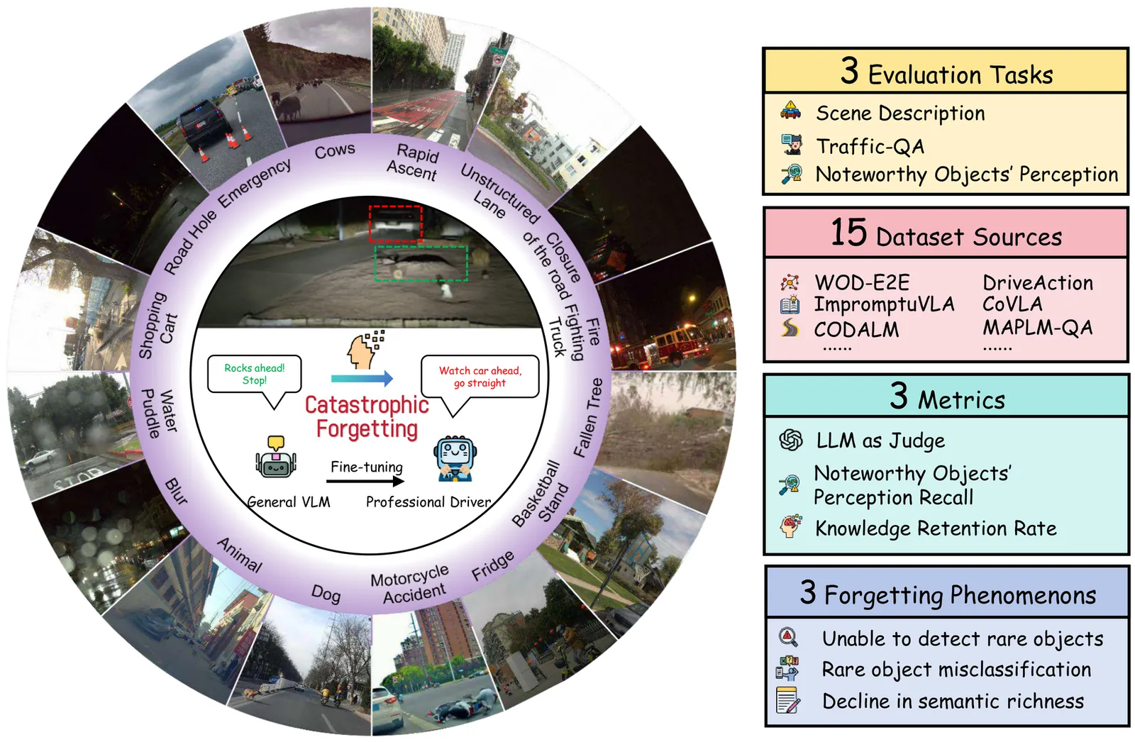The integration of Vision-Language Models (VLMs) into autonomous driving promises to solve long-tail scenarios, but this paradigm faces the critical and unaddressed challenge of catastrophic forgetting. The very fine-tuning process used to adapt these models to driving-specific data simultaneously erodes their invaluable pre-trained world knowledge, creating a self-defeating paradox that undermines the core reason for their use. This paper provides the first systematic investigation into this phenomenon. We introduce a new large-scale dataset of 180K scenes, which enables the first-ever benchmark specifically designed to quantify catastrophic forgetting in autonomous driving. Our analysis reveals that existing methods suffer from significant knowledge degradation. To address this, we propose the Drive Expert Adapter (DEA), a novel framework that circumvents this trade-off by shifting adaptation from the weight space to the prompt space. DEA dynamically routes inference through different knowledge experts based on scene-specific cues, enhancing driving-task performance without corrupting the model's foundational parameters. Extensive experiments demonstrate that our approach not only achieves state-of-the-art results on driving tasks but also effectively mitigates catastrophic forgetting, preserving the essential generalization capabilities that make VLMs a transformative force for autonomous systems. Data and model are released at FidelityDrivingBench.