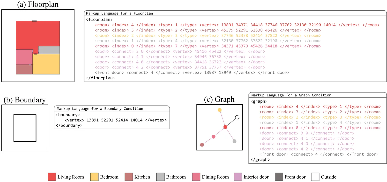 Automatic residential floorplan generation has long been a central challenge bridging architecture and computer graphics, aiming to make spatial design more efficient and accessible. While early methods based on constraint satisfaction or combinatorial optimization ensure feasibility, they lack diversity and flexibility. Recent generative models achieve promising results but struggle to generalize across heterogeneous conditional tasks, such as generation from site boundaries, room adjacency graphs, or partial layouts, due to their suboptimal representations. To address this gap, we introduce Floorplan Markup Language (FML), a general representation that encodes floorplan information within a single structured grammar, which casts the entire floorplan generation problem into a next token prediction task. Leveraging FML, we develop a transformer-based generative model, FMLM, capable of producing high-fidelity and functional floorplans under diverse conditions. Comprehensive experiments on the RPLAN dataset demonstrate that FMLM, despite being a single model, surpasses the previous task-specific state-of-the-art methods.