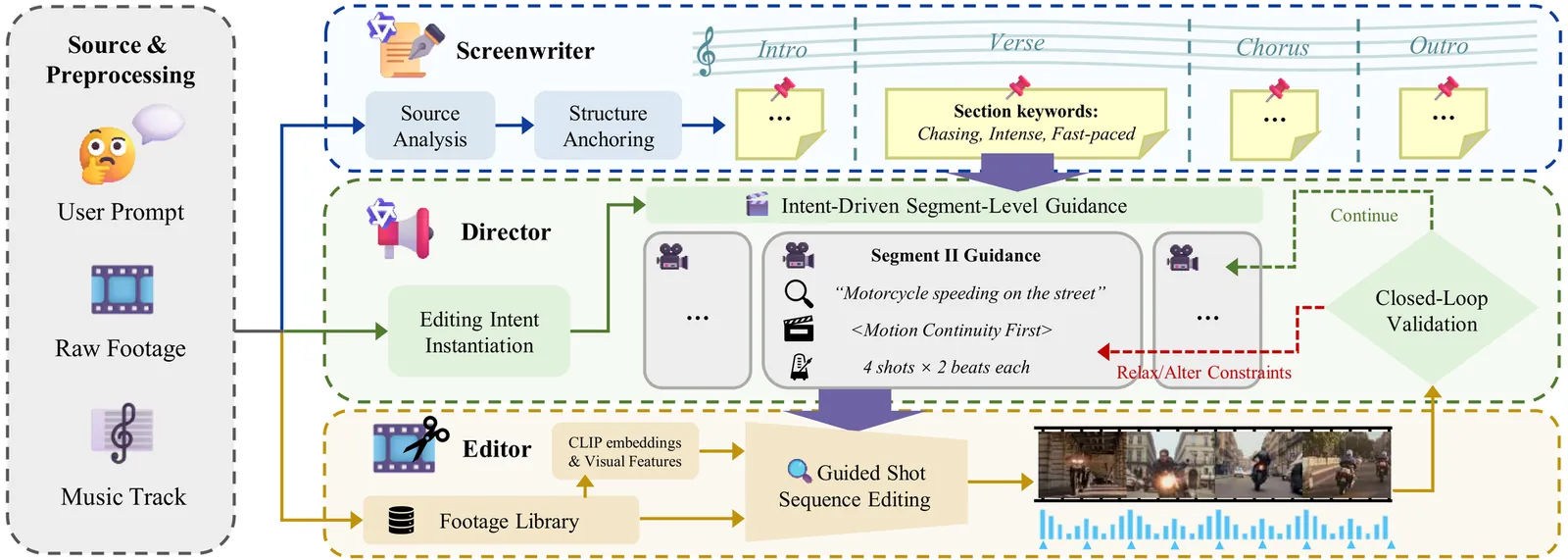 Video mashup creation represents a complex video editing paradigm that recomposes existing footage to craft engaging audio-visual experiences, demanding intricate orchestration across semantic, visual, and auditory dimensions and multiple levels. However, existing automated editing frameworks often overlook the cross-level multimodal orchestration to achieve professional-grade fluidity, resulting in disjointed sequences with abrupt visual transitions and musical misalignment. To address this, we formulate video mashup creation as a Multimodal Coherency Satisfaction Problem (MMCSP) and propose the DIRECT framework. Simulating a professional production pipeline, our hierarchical multi-agent framework decomposes the challenge into three cascade levels: the Screenwriter for source-aware global structural anchoring, the Director for instantiating adaptive editing intent and guidance, and the Editor for intent-guided shot sequence editing with fine-grained optimization. We further introduce Mashup-Bench, a comprehensive benchmark with tailored metrics for visual continuity and auditory alignment. Extensive experiments demonstrate that DIRECT significantly outperforms state-of-the-art baselines in both objective metrics and human subjective evaluation. Project page and code: https://github.com/AK-DREAM/DIRECT