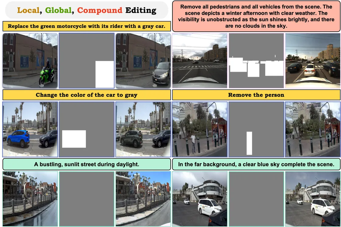Ensuring safety in autonomous driving requires scalable generation of realistic, controllable driving scenes beyond what real-world testing provides. Yet existing instruction guided image editors, trained on object-centric or artistic data, struggle with dense, safety-critical driving layouts. We propose HorizonWeaver, which tackles three fundamental challenges in driving scene editing: (1) multi-level granularity, requiring coherent object- and scene-level edits in dense environments; (2) rich high-level semantics, preserving diverse objects while following detailed instructions; and (3) ubiquitous domain shifts, handling changes in climate, layout, and traffic across unseen environments. The core of HorizonWeaver is a set of complementary contributions across data, model, and training: (1) Data: Large-scale dataset generation, where we build a paired real/synthetic dataset from Boreas, nuScenes, and Argoverse2 to improve generalization; (2) Model: Language-Guided Masks for fine-grained editing, where semantics-enriched masks and prompts enable precise, language-guided edits; and (3) Training: Content preservation and instruction alignment, where joint losses enforce scene consistency and instruction fidelity. Together, HorizonWeaver provides a scalable framework for photorealistic, instruction-driven editing of complex driving scenes, collecting 255K images across 13 editing categories and outperforming prior methods in L1, CLIP, and DINO metrics, achieving +46.4% user preference and improving BEV segmentation IoU by +33%. Project page: https://msoroco.github.io/horizonweaver/