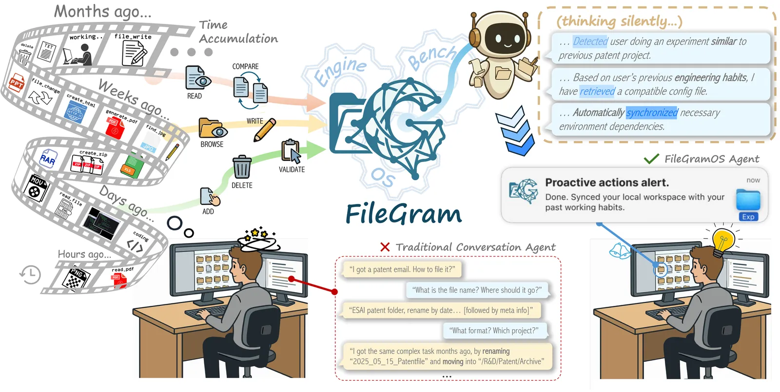 Coworking AI agents operating within local file systems are rapidly emerging as a paradigm in human-AI interaction; however, effective personalization remains limited by severe data constraints, as strict privacy barriers and the difficulty of jointly collecting multimodal real-world traces prevent scalable training and evaluation, and existing methods remain interaction-centric while overlooking dense behavioral traces in file-system operations; to address this gap, we propose FileGram, a comprehensive framework that grounds agent memory and personalization in file-system behavioral traces, comprising three core components: (1) FileGramEngine, a scalable persona-driven data engine that simulates realistic workflows and generates fine-grained multimodal action sequences at scale; (2) FileGramBench, a diagnostic benchmark grounded in file-system behavioral traces for evaluating memory systems on profile reconstruction, trace disentanglement, persona drift detection, and multimodal grounding; and (3) FileGramOS, a bottom-up memory architecture that builds user profiles directly from atomic actions and content deltas rather than dialogue summaries, encoding these traces into procedural, semantic, and episodic channels with query-time abstraction; extensive experiments show that FileGramBench remains challenging for state-of-the-art memory systems and that FileGramEngine and FileGramOS are effective, and by open-sourcing the framework, we hope to support future research on personalized memory-centric file-system agents.