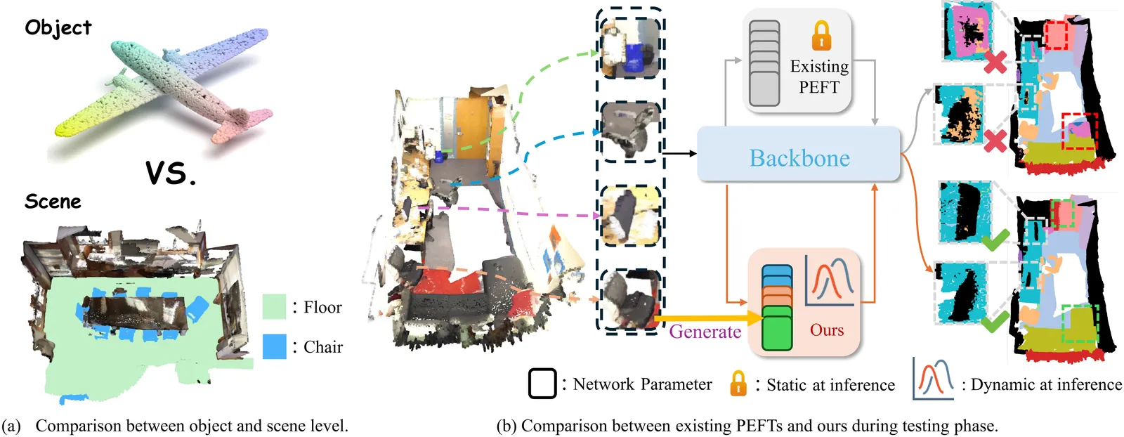 Scene-level point cloud understanding remains challenging due to diverse geometries, imbalanced category distributions, and highly varied spatial layouts. Existing methods improve object-level performance but rely on static network parameters during inference, limiting their adaptability to dynamic scene data. We propose PointTPA, a Test-time Parameter Adaptation framework that generates input-aware network parameters for scene-level point clouds. PointTPA adopts a Serialization-based Neighborhood Grouping (SNG) to form locally coherent patches and a Dynamic Parameter Projector (DPP) to produce patch-wise adaptive weights, enabling the backbone to adjust its behavior according to scene-specific variations while maintaining a low parameter overhead. Integrated into the PTv3 structure, PointTPA demonstrates strong parameter efficiency by introducing two lightweight modules of less than 2% of the backbone's parameters. Despite this minimal parameter overhead, PointTPA achieves 78.4% mIoU on ScanNet validation, surpassing existing parameter-efficient fine-tuning (PEFT) methods across multiple benchmarks, highlighting the efficacy of our test-time dynamic network parameter adaptation mechanism in enhancing 3D scene understanding. The code is available at https://github.com/H-EmbodVis/PointTPA.