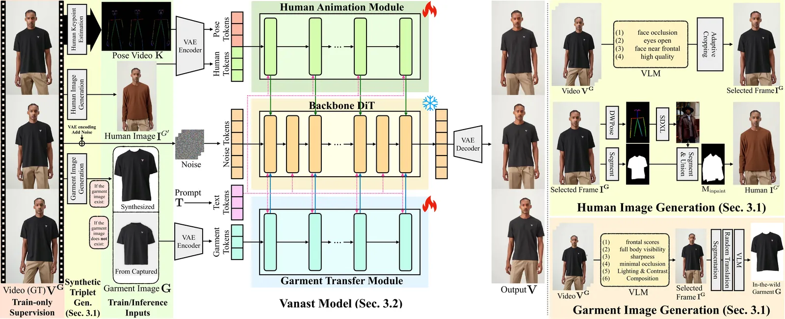We present Vanast, a unified framework that generates garment-transferred human animation videos directly from a single human image, garment images, and a pose guidance video. Conventional two-stage pipelines treat image-based virtual try-on and pose-driven animation as separate processes, which often results in identity drift, garment distortion, and front-back inconsistency. Our model addresses these issues by performing the entire process in a single unified step to achieve coherent synthesis. To enable this setting, we construct large-scale triplet supervision. Our data generation pipeline includes generating identity-preserving human images in alternative outfits that differ from garment catalog images, capturing full upper and lower garment triplets to overcome the single-garment-posed video pair limitation, and assembling diverse in-the-wild triplets without requiring garment catalog images. We further introduce a Dual Module architecture for video diffusion transformers to stabilize training, preserve pretrained generative quality, and improve garment accuracy, pose adherence, and identity preservation while supporting zero-shot garment interpolation. Together, these contributions allow Vanast to produce high-fidelity, identity-consistent animation across a wide range of garment types.