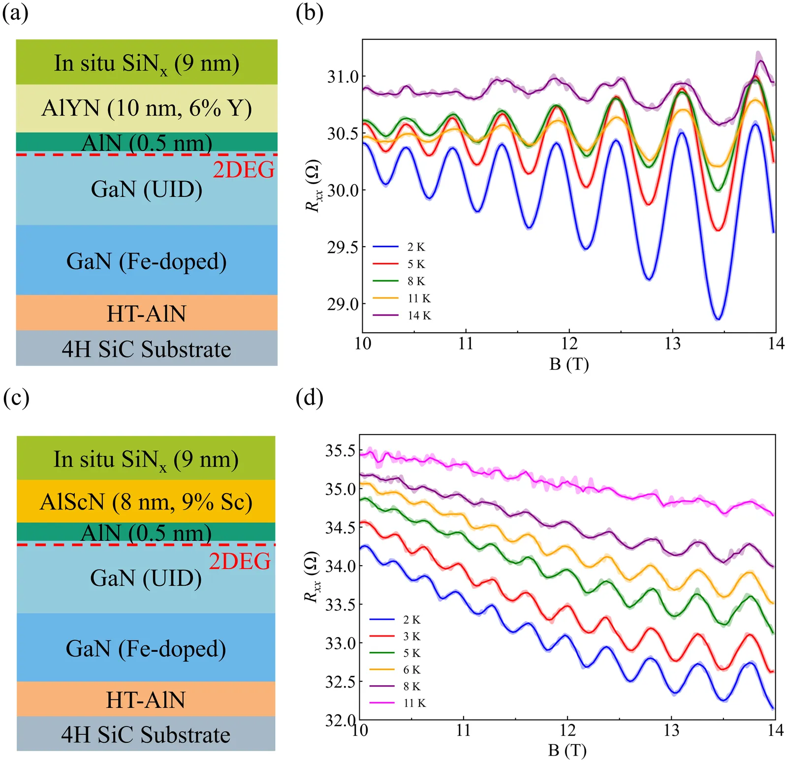 AlYN and AlScN have recently emerged as promising nitride materials that can be integrated with GaN to form two-dimensional electron gases (2DEGs) at heterojunctions. Electron transport properties in these heterostructures have been enhanced through careful design and optimization of epitaxial growth conditions. In this work, we report for the first time Shubnikov-de Haas (SdH) oscillations of 2DEGs in AlYN/GaN and AlScN/GaN heterostructures, grown by metal-organic chemical vapor deposition. SdH oscillations provide direct access to key 2DEG parameters at the Fermi level: (1) carrier density, (2) electron effective mass (m* ~ 0.24 me for AlYN/GaN and m* ~ 0.25 me for AlScN/GaN), and (3) quantum scattering time (~ 68 fs for AlYN/GaN and ~ 70 fs for AlScN/GaN). These measurements of fundamental transport properties provide critical insights for advancing emerging nitride semiconductors for future high-frequency and power electronics.