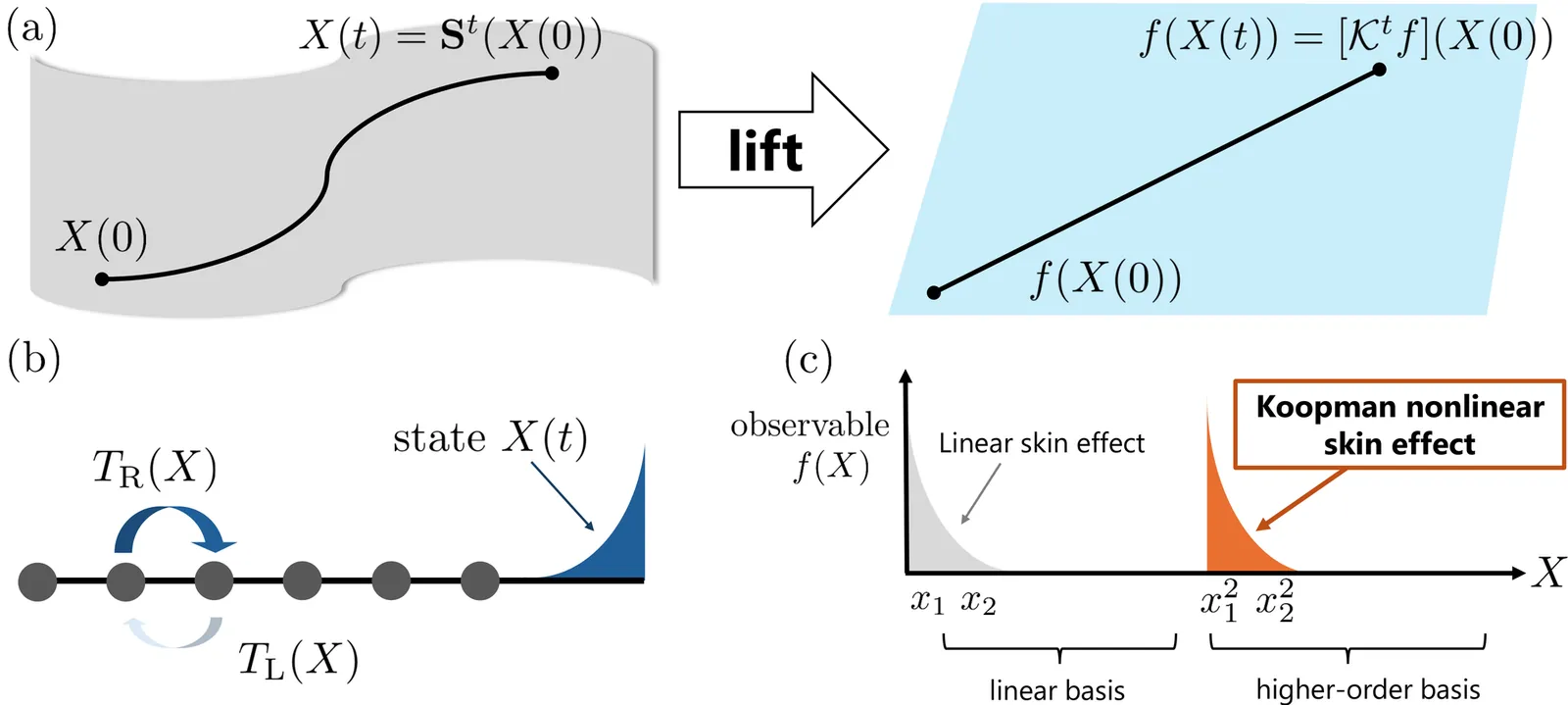 Non-Hermitian skin effects are conventionally manifested as boundary localization of eigenstates in linear systems. In nonlinear settings, however, where eigenstates are no longer well defined, it becomes unclear how skin effects should be faithfully characterized. Here, we propose a Koopman-based characterization of nonlinear skin effects, in which localization is defined in terms of Koopman eigenfunctions in a lifted observable space, rather than physical states. Using a minimal nonlinear extension of the Hatano-Nelson model, we show that dominant Koopman eigenfunctions localize sharply on higher-order observables, in stark contrast to linear skin effects confined to linear observables. This lifted-space localization governs the sensitivity to boundary amplitude perturbations, providing a distinct dynamical signature of the nonlinear skin effect. Our results establish the Koopman framework as a natural setting in which skin effects unique to nonlinear non-Hermitian systems can be identified.