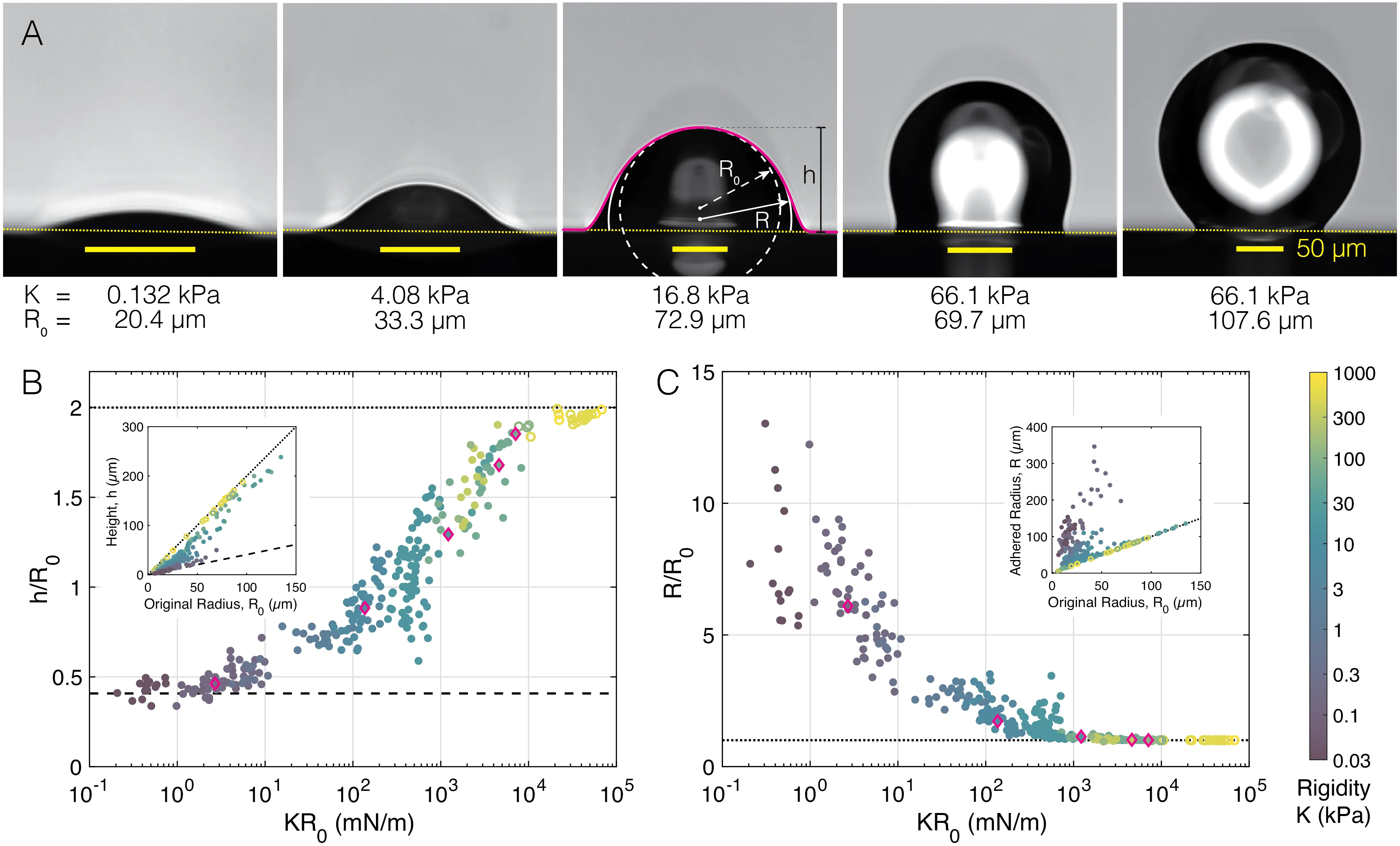 Softer means stickier for solid adhesives, because material compliance facilitates close contact between non-conformal surfaces. Recent discoveries have revealed that soft materials can exhibit a rich array of new physics arising from competing effects of continuum elasticity, fluid-like surface mechanics, and internal poroelastic flows, all of which can directly impact interfacial interactions. In this work, we investigate this complex interplay across several orders of magnitude of elastic stiffness by measuring the complete adhesive contact geometry between compliant silicone gel microspheres and flat, rigid substrates. We observe a continuous elastocapillary transition in adhesion mechanics, with novel features revealed by both the breadth of data and the detailed contact geometries. Importantly, soft gel spheres exhibit a remarkably broad range of near-equilibrium contact morphologies and their contact line deformation is always mediated by a fluid contact zone that phase separates from the gel. To explain this, we develop a new model incorporating elastocapillary and poroelastic mechanics that predicts the complete range of adhesive behavior and elucidates energetic tradeoffs. The data and model together reveal a shallow energy landscape that may contribute to the robustness of everyday adhesives.