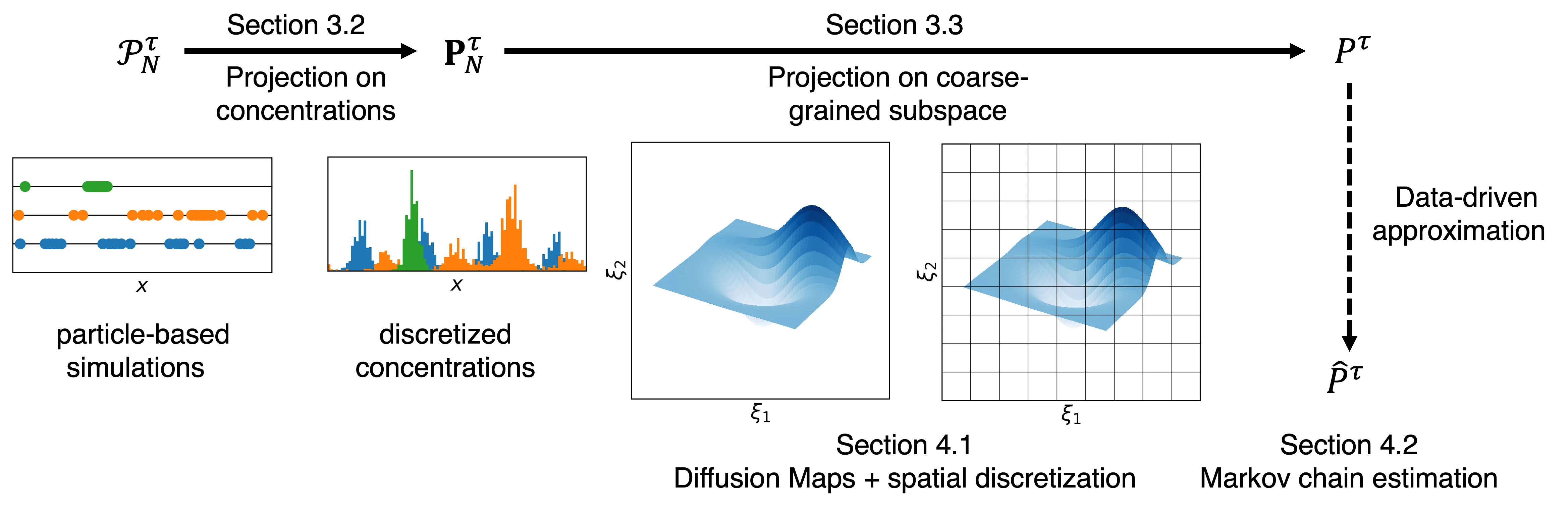 We develop an operator-based framework to coarse-grain interacting particle systems that exhibit clustering dynamics. Starting from the particle-based transfer operator, we first construct a sequence of reduced representations: the operator is projected onto concentrations and then further reduced by representing the concentration dynamics on a geometric low-dimensional manifold and an adapted finite-state discretization. The resulting coarse-grained transfer operator is finally estimated from dynamical simulation data by inferring the transition probabilities between the Markov states. Applied to systems with multichromatic and Morse interaction potentials, the reduced model reproduces key features of the clustering process, including transitions between cluster configurations and the emergence of metastable states. Spectral analysis and transition-path analysis of the estimated operator reveal implied time scales and dominant transition pathways, providing an interpretable and efficient description of particle-clustering dynamics.