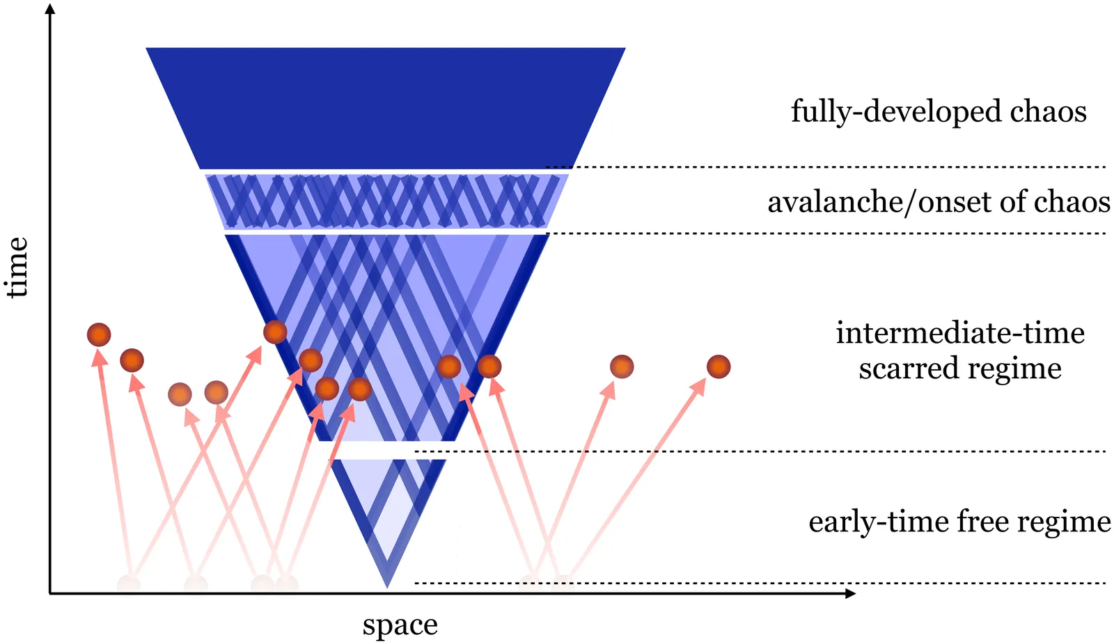 Many-body chaos is a default property of many-body systems; at the same time, near-integrable behaviour due to weakly interacting quasiparticles is ubiquitous throughout condensed matter at low temperature. There must therefore be a, possibly generic, crossover between these very different regimes. Here, we develop a theory encapsulating the notion of a cascade of lightcones seeded by sequences of scattering of weakly interacting harmonic modes as witnessed by a suitably defined chaos diagnostic (classical decorrelator) that measures the spatiotemporal profile of many-body chaos. Our numerics deals with the concrete case of a classical Heisenberg chain, for either sign of the interaction, at low temperatures where the short-time dynamics are well captured in terms of non-interacting spin waves. To model low-temperature dynamics, we use ensembles of initial states with randomly embedded point defects in an otherwise ordered background, which provides a controlled setting for studying the scattering events. The decorrelator exhibits a short-time integrable regime followed by an intermediate `scarred' regime of the cascade of lightcones in progress; these then overlap, leading to an avalanche of scattering events which finally yields the standard long-time signature of many-body chaos.