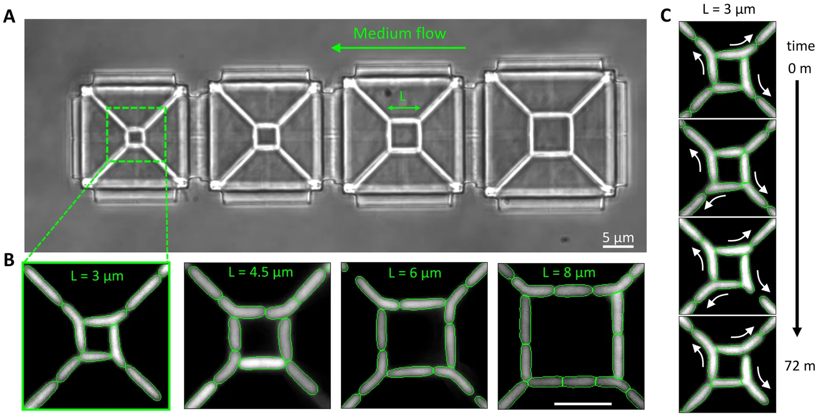 Proliferation is a defining feature of life. Through growth, division, and death, living systems consume energy and inject mass, breaking conservation laws and driving collective phenomena from biofilm formation to embryonic development. Yet, while active matter physics has advanced our understanding of self-propelled agents, quantitative frameworks for proliferating systems are still emerging, and most work focuses on simplified settings. Here, we study \textit{E.coli} bacteria growing inside a network of single-file microchannels as a minimal model of structured environments. Competition for free volume drives the spontaneous emergence of coherent growth patterns that persist across generations but vanish when the channel links exceed the typical cell size at birth. Despite the strongly out-of-equilibrium character of the dynamics, the observed phenomenology can be quantitatively captured by an effective equilibrium description in which the flow state at each node is represented by a spin variable with ferromagnetic interactions. Simulations of growing elastic cells show that this coupling arises from internal stress accumulated at network nodes due to dynamical constraints. Our results reveal a surprising correspondence between proliferating active matter and equilibrium statistical mechanics, highlighting open fundamental questions and offering a first step toward describing growth phenomena in real-world complex environments.