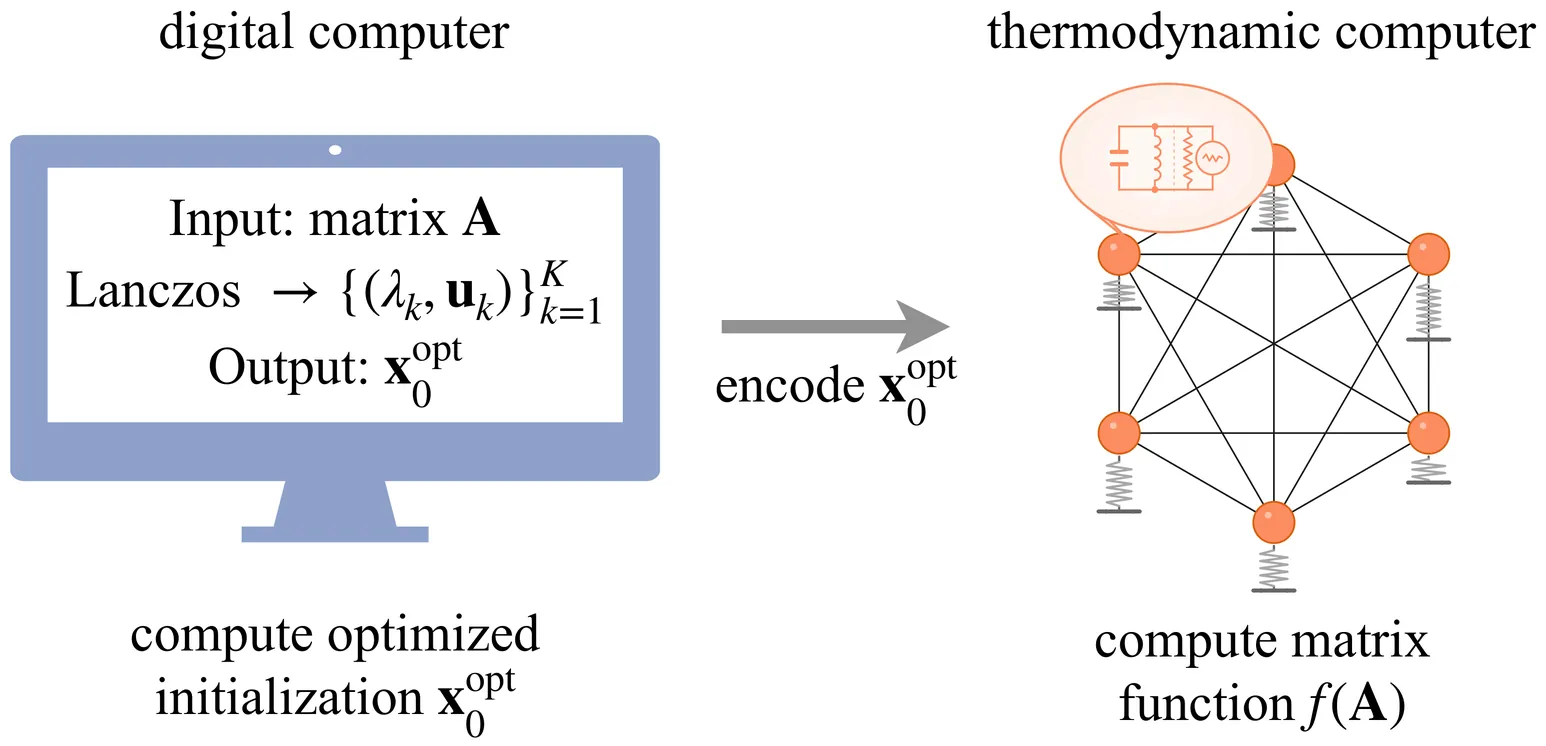 Thermodynamic computing harnesses the relaxation dynamics of physical systems to perform matrix operations. A key limitation of such approaches is the often long thermalization time required for the system to approach equilibrium with sufficient accuracy. Here, we introduce a hybrid digital-thermodynamic algorithm that substantially accelerates relaxation through optimized initializations inspired by the Mpemba effect. In the proposed scheme, a classical digital processor efficiently computes an initialization that suppresses slow relaxation modes, after which the physical system performs the remaining computation through its intrinsic relaxation dynamics. We focus on overdamped Langevin dynamics for quadratic energy landscapes, analyzing the spectral structure of the associated Fokker-Planck operator and identifying the corresponding optimal initial covariances. This yields a predictable reduction in thermalization time, determined by the spectrum of the encoded matrix. We derive analytic expressions for the resulting speedups and numerically analyze thermodynamic implementations of matrix inversion and determinant computation as concrete examples. Our results show that optimized initialization protocols provide a simple and broadly applicable route to accelerating thermodynamic computations.