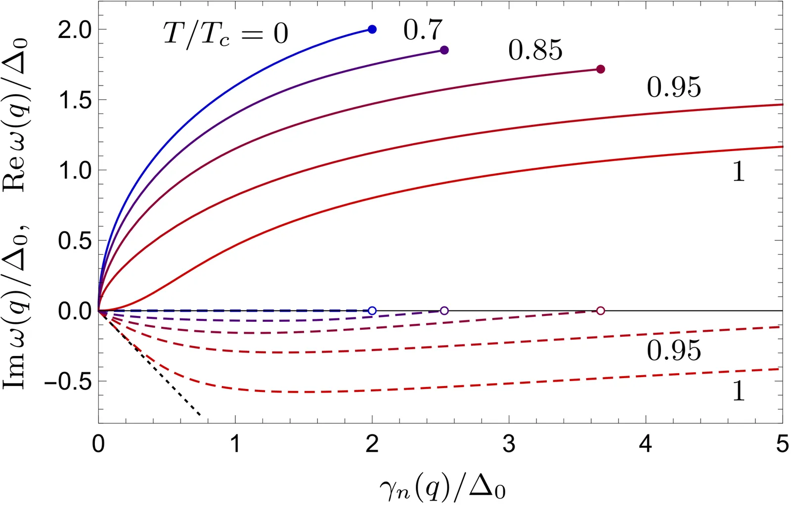 We develop a theory for the plasmon spectrum in dirty superconductors across the entire temperature range. Starting with the microscopic Keldysh sigma model description, we link the plasmon dispersion $ω(q)$ to the optical conductivity $σ(ω,T)$ of a superconductor, which requires analytical continuation to the lower half-plane of complex frequency. This approach reveals a discontinuity at the superconducting transition: a jump in both the real and imaginary parts of $ω(q)$ at $T_c$. For any temperature below $T_c$, the plasmon dispersion terminates at a critical wave vector $q_c(T)$ where plasmons remains undamped, with weakly $T$-dependent $ω[q_c(T)] \approx 2Δ(0)$. Plasmons significantly attenuate only within a narrow 5% temperature window near $T_c$, with the propagating mode recovering at large $q$.