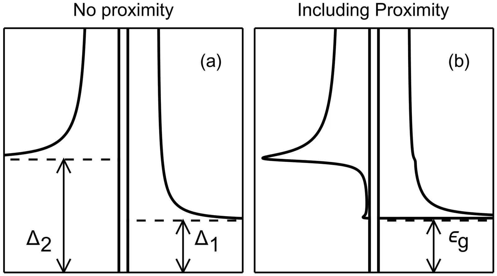 The standard mean-field treatment of low-temperature superconductors leads to a square-root divergent density of states at the gap value. This feature can lead to unphysical logarithmic divergences in various quantities, such as currents and qubit transition rates. We revisit their possible regularization based on the proximity effect between two superconducting films with different gaps. We derive analytical approximations for the density of states in each superconducting film. We find that the smearing of the density of states grows with the gap asymmetry. As a concrete example, we discuss the regularization of transition rates in qubits with frequency close to resonance with the gap asymmetry between the two films, and the consequent smoothening of the jump discontinuity in the qubit frequency shift.