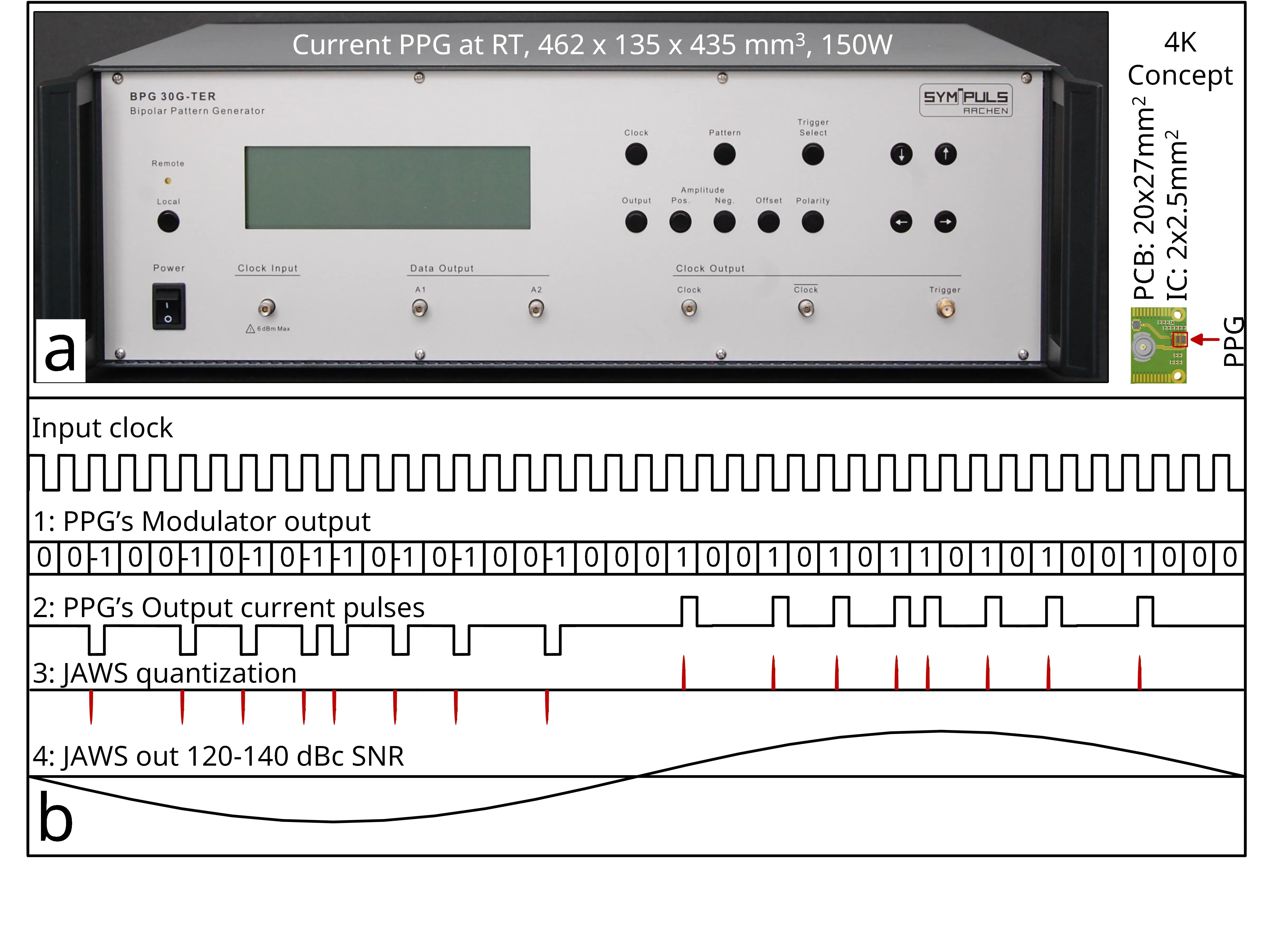 We combine a cryogenic BiCMOS integrated circuit, which generates high-speed return-to-zero (RTZ) pulses, with a superconducting Josephson junction array. The BiCMOS circuit acts as a cryogenic pulse pattern generator, delivering data rates of 30 Gb/s, while consuming 302 mW at 4 K. Each electrical pulse of the serializer effectively transfers one magnetic flux quantum through every Josephson junction, so that the average output voltage of the array produces well-defined plateaus (Shapiro steps) in its current-to-voltage characteristic. To the best of our knowledge, this is the first integration of a Josephson junction array with a cryogenic BiCMOS chip. The presented results pave the way toward a hybrid and fully integrated Josephson arbitrary waveform synthesizer (JAWS) that can generate ultra-low-noise signals for quantum voltage metrology and quantum information systems.