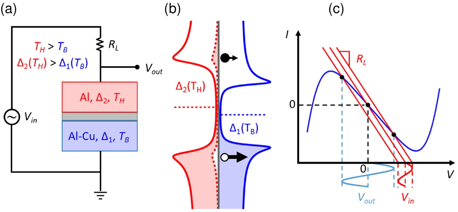 We introduce a zero-bias superconducting voltage amplifier that harvests energy from a thermal gradient by exploiting negative differential resistance (NDR) in an asymmetric tunnel junction. The device is based on an asymmetric superconductor-insulator-superconductor (SIS) junction with an energy-gap ratio of $Δ_1/Δ_2 = 0.5$, connected in series with a load resistor. Owing to the superconducting bipolar thermoelectric effect, the current-voltage characteristic of the junction exhibits a region of NDR, in which the net current flows opposite to the applied voltage. This mechanism enables voltage amplification in the absence of any external electrical bias, relying solely on the temperature difference between the electrodes ($T_H \simeq 1$ K, $T_B \simeq 20$ mK). Numerical simulations predict a voltage gain of 20 dB, a 1 dB compression point at an input amplitude of 2 $μ$V, and a total harmonic distortion below $-50$ dB. The input-referred noise is approximately 1 nV/$\sqrt{Hz}$, with an associated thermal load on the order of nanowatts. The frequency response is broadband from near DC, with a $-3$ dB cutoff around 180 MHz, set by the RC time constant of the junction. Using Al-, Al-Cu-, and AlO$_x$-based technologies, the amplifier is compatible with conventional superconducting circuit fabrication processes. These findings demonstrate that thermoelectric superconducting junctions can deliver bias-free voltage amplification from near DC up to about 200 MHz, making them promising candidates for transition-edge sensor readout, quantum circuit instrumentation, and low-frequency cryogenic signal processing.