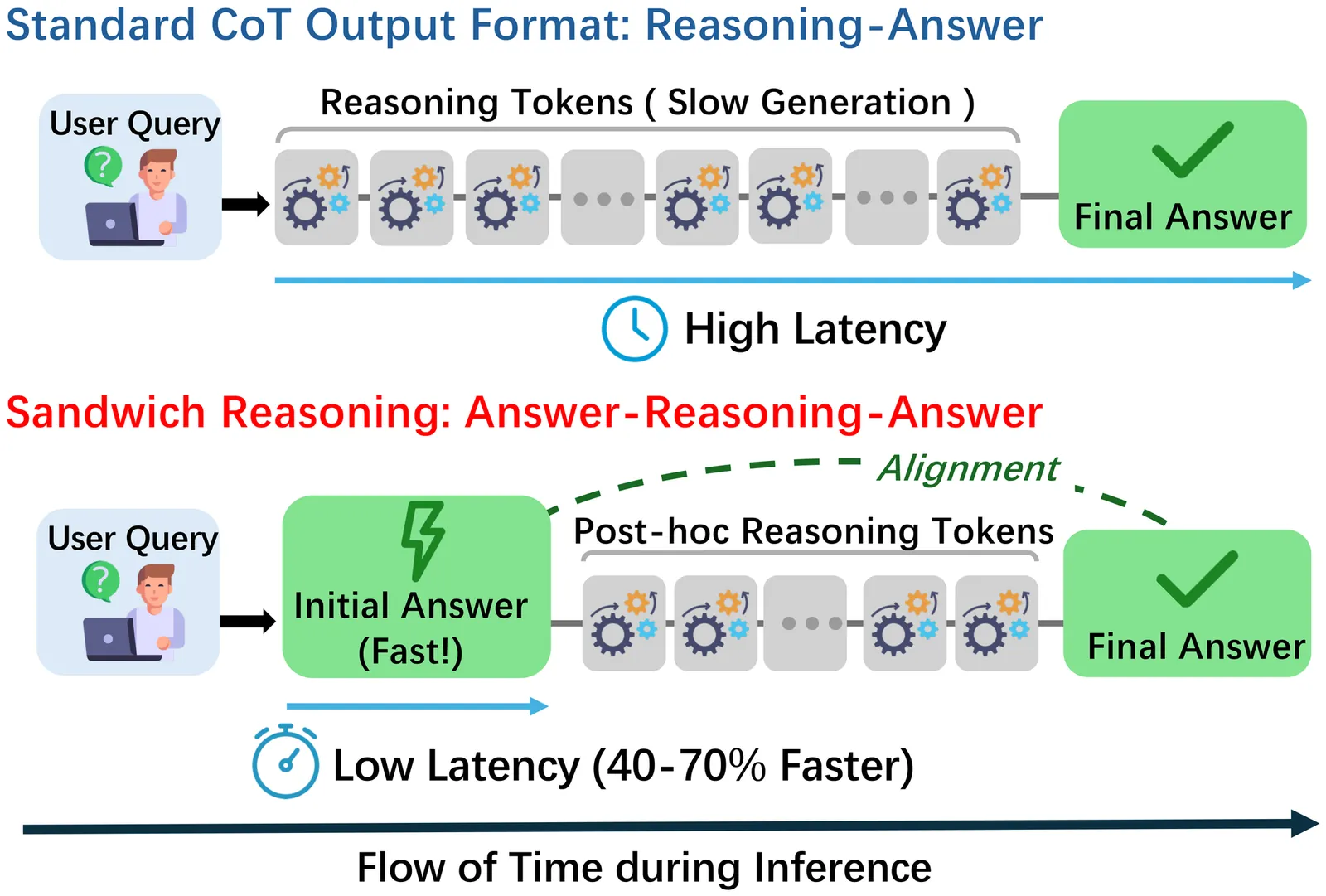 Query correction is a critical entry point in modern search pipelines, demanding high accuracy strictly within real-time latency constraints. Chain-of-Thought (CoT) reasoning improves accuracy but incurs prohibitive latency for real-time query correction. A potential solution is to output an answer before reasoning to reduce latency; however, under autoregressive decoding, the early answer is independent of subsequent reasoning, preventing the model from leveraging its reasoning capability to improve accuracy. To address this issue, we propose Sandwich Reasoning (SandwichR), a novel approach that explicitly aligns a fast initial answer with post-hoc reasoning, enabling low-latency query correction without sacrificing reasoning-aware accuracy. SandwichR follows an Answer-Reasoning-Answer paradigm, producing an initial correction, an explicit reasoning process, and a final refined correction. To align the initial answer with post-reasoning insights, we design a consistency-aware reinforcement learning (RL) strategy: a dedicated consistency reward enforces alignment between the initial and final corrections, while margin-based rejection sampling prioritizes borderline samples where reasoning drives the most impactful corrective gains. Additionally, we construct a high-quality query correction dataset, addressing the lack of specialized benchmarks for complex query correction. Experimental results demonstrate that SandwichR achieves SOTA accuracy comparable to standard CoT while delivering a 40-70% latency reduction, resolving the latency-accuracy trade-off in online search.