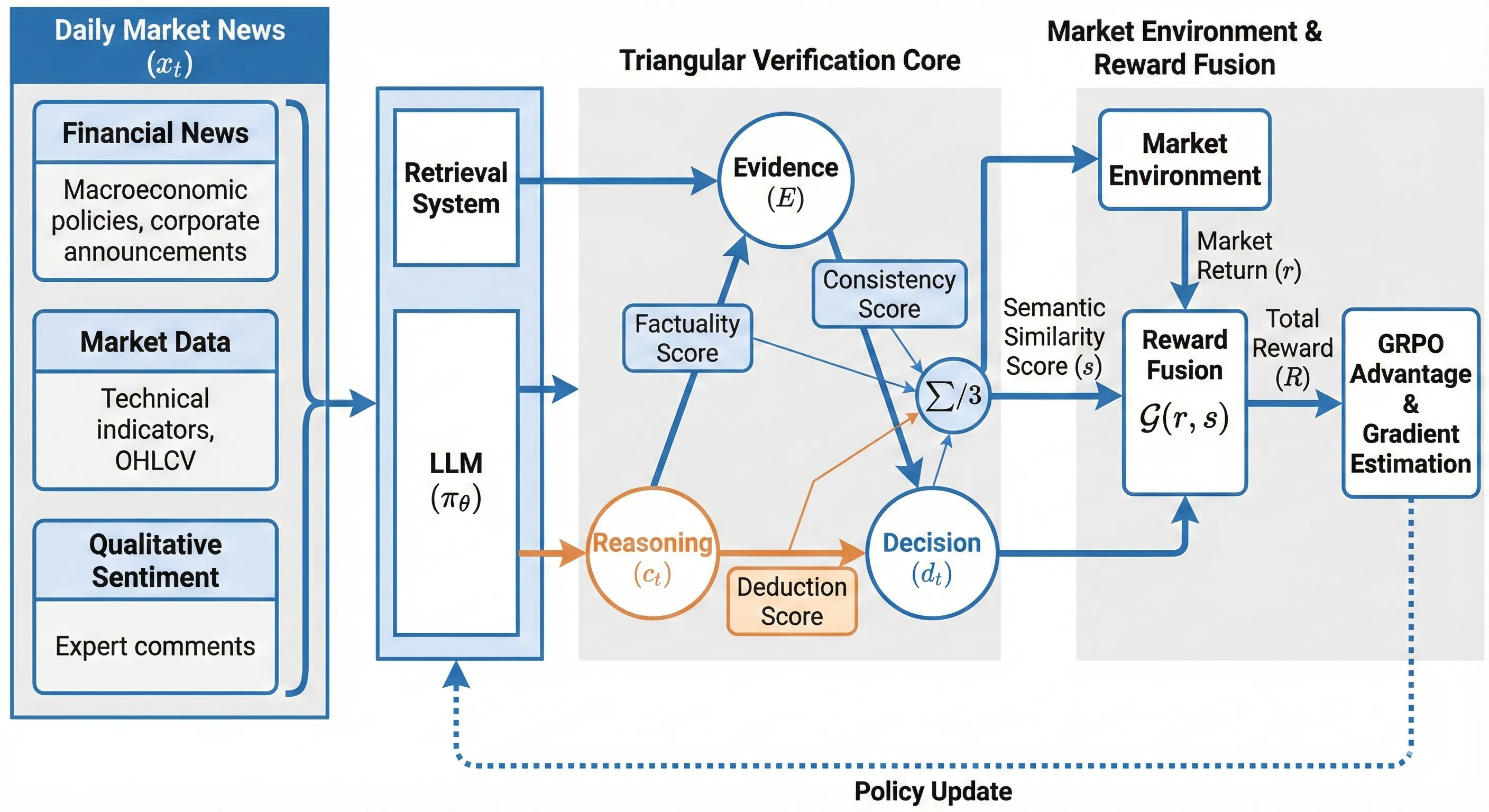 Reinforcement Learning (RL) has enabled Large Language Models (LLMs) to achieve remarkable reasoning in domains like mathematics and coding, where verifiable rewards provide clear signals. However, extending this paradigm to financial decision is challenged by the market's stochastic nature: rewards are verifiable but inherently noisy, causing standard RL to degenerate into reward hacking. To address this, we propose Trade-R1, a model training framework that bridges verifiable rewards to stochastic environments via process-level reasoning verification. Our key innovation is a verification method that transforms the problem of evaluating reasoning over lengthy financial documents into a structured Retrieval-Augmented Generation (RAG) task. We construct a triangular consistency metric, assessing pairwise alignment between retrieved evidence, reasoning chains, and decisions to serve as a validity filter for noisy market returns. We explore two reward integration strategies: Fixed-effect Semantic Reward (FSR) for stable alignment signals, and Dynamic-effect Semantic Reward (DSR) for coupled magnitude optimization. Experiments on different country asset selection demonstrate that our paradigm reduces reward hacking, with DSR achieving superior cross-market generalization while maintaining the highest reasoning consistency.