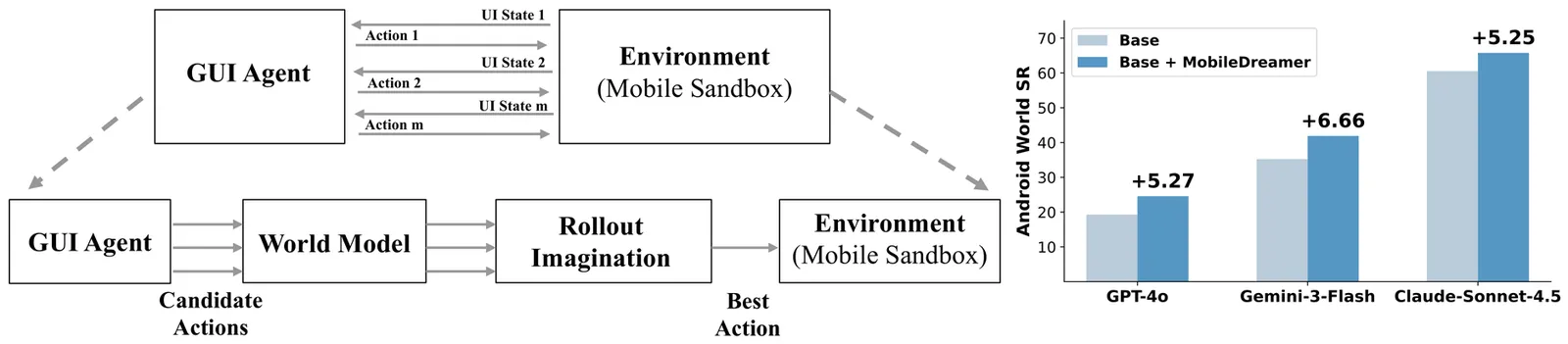 Mobile GUI agents have shown strong potential in real-world automation and practical applications. However, most existing agents remain reactive, making decisions mainly from current screen, which limits their performance on long-horizon tasks. Building a world model from repeated interactions enables forecasting action outcomes and supports better decision making for mobile GUI agents. This is challenging because the model must predict post-action states with spatial awareness while remaining efficient enough for practical deployment. In this paper, we propose MobileDreamer, an efficient world-model-based lookahead framework to equip the GUI agents based on the future imagination provided by the world model. It consists of textual sketch world model and rollout imagination for GUI agent. Textual sketch world model forecasts post-action states through a learning process to transform digital images into key task-related sketches, and designs a novel order-invariant learning strategy to preserve the spatial information of GUI elements. The rollout imagination strategy for GUI agent optimizes the action-selection process by leveraging the prediction capability of world model. Experiments on Android World show that MobileDreamer achieves state-of-the-art performance and improves task success by 5.25%. World model evaluations further verify that our textual sketch modeling accurately forecasts key GUI elements.