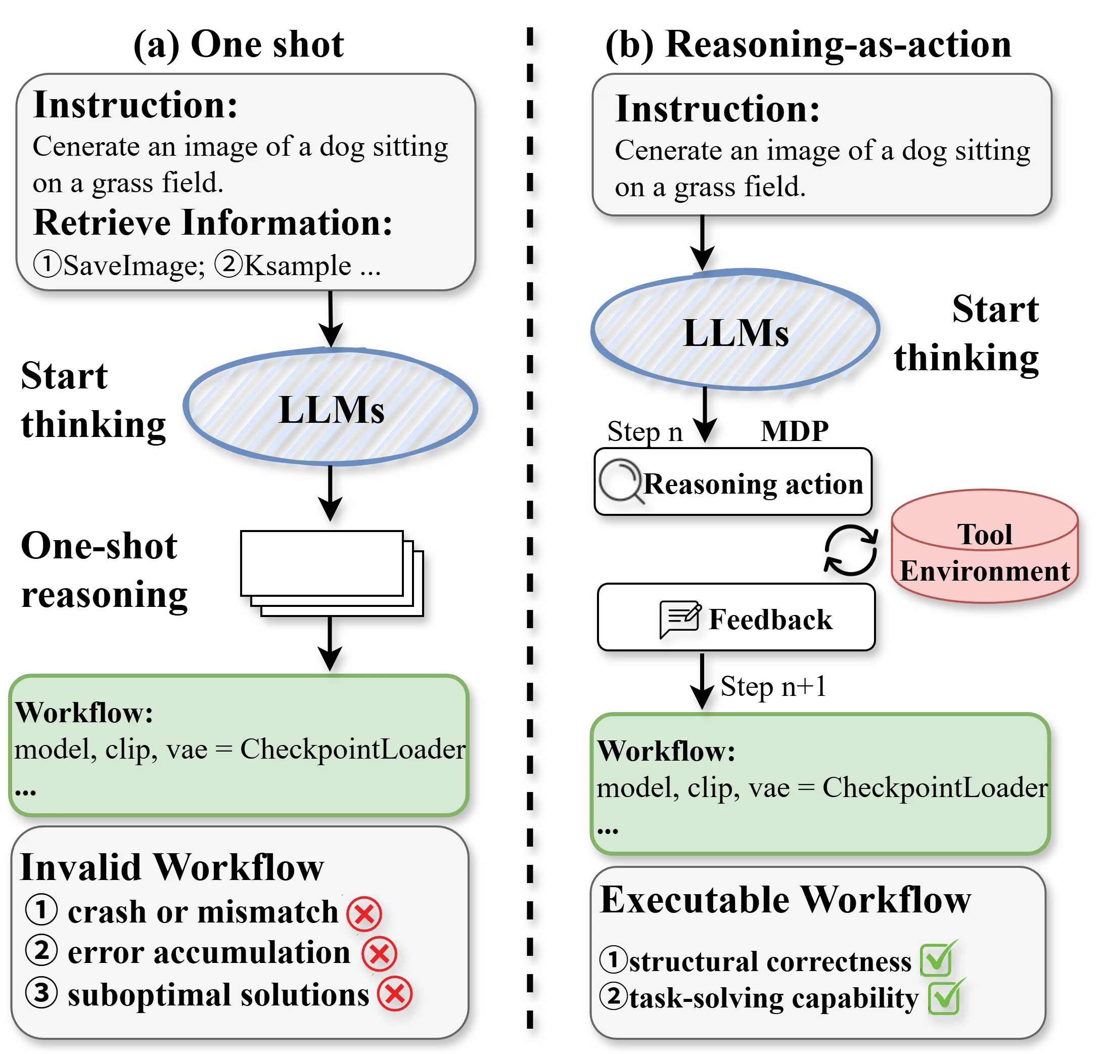 AI-generated content has progressed from monolithic models to modular workflows, especially on platforms like ComfyUI, allowing users to customize complex creative pipelines. However, the large number of components in ComfyUI and the difficulty of maintaining long-horizon structural consistency under strict graph constraints frequently lead to low pass rates and workflows of limited quality. To tackle these limitations, we present ComfySearch, an agentic framework that can effectively explore the component space and generate functional ComfyUI pipelines via validation-guided workflow construction. Experiments demonstrate that ComfySearch substantially outperforms existing methods on complex and creative tasks, achieving higher executability (pass) rates, higher solution rates, and stronger generalization.