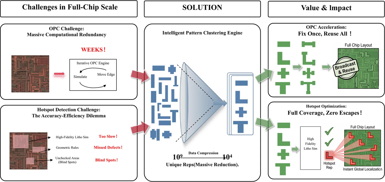 With the aggressive scaling of VLSI technology, the explosion of layout patterns creates a critical bottleneck for DFM applications like OPC. Pattern clustering is essential to reduce data complexity, yet existing methods struggle with computational prohibitiveness ($O(N^2)$ comparisons), sub-optimal discrete sampling for center alignment, and difficult speed-quality trade-offs. To address these, we propose an Optimal Alignment-Driven Iterative Closed-Loop Convergence Framework. First, to resolve alignment ambiguity, we introduce a hybrid suite of high-performance algorithms: an FFT-based Phase Correlation method for cosine similarity constraints, and a Robust Geometric Min-Max strategy for edge displacement constraints that analytically solves for the global optimum. Second, we model clustering as a Set Cover Problem (SCP) using a Surprisal-Based Lazy Greedy heuristic within a coarse-to-fine iterative refinement loop to ensure convergence. Additionally, a multi-stage pruning mechanism filters over 99% of redundant computations. Experimental results on the 2025 China Postgraduate EDA Elite Challenge benchmark demonstrate a 93.4% compression ratio relative to raw inputs and an over 100x speedup compared to the official baseline, effectively handling tens of thousands of patterns in seconds. Securing First Place among 77 teams, this approach proves its superiority in solving the NP-Hard layout clustering problem with an optimal balance of scalability and precision.