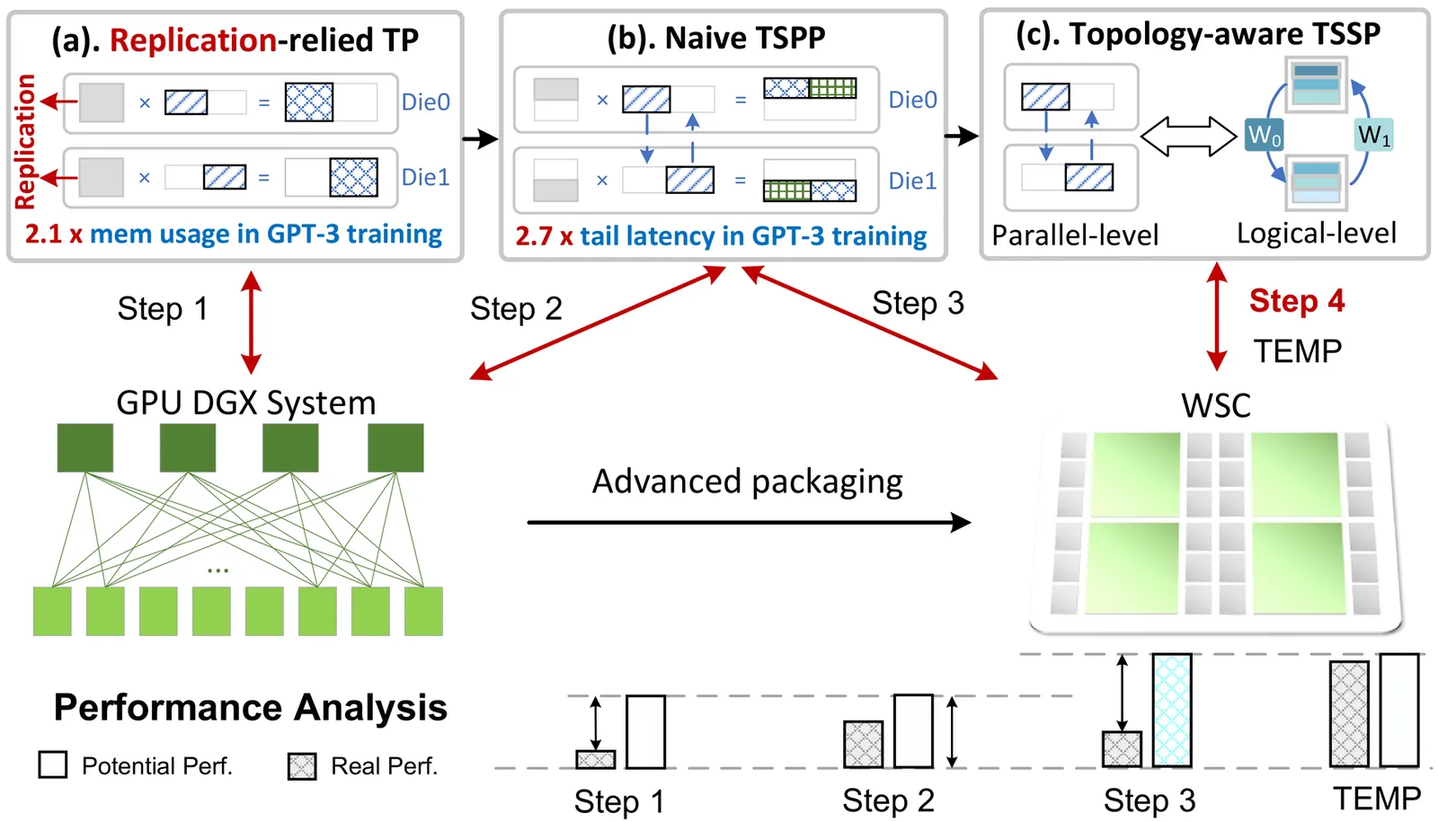 Large language models (LLMs) demand significant memory and computation resources. Wafer-scale chips (WSCs) provide high computation power and die-to-die (D2D) bandwidth but face a unique trade-off between on-chip memory and compute resources due to limited wafer area. Therefore, tensor parallelism strategies for wafer should leverage communication advantages while maintaining memory efficiency to maximize WSC performance. However, existing approaches fail to address these challenges. To address these challenges, we propose the tensor stream partition paradigm (TSPP), which reveals an opportunity to leverage WSCs' abundant communication bandwidth to alleviate stringent on-chip memory constraints. However, the 2D mesh topology of WSCs lacks long-distance and flexible interconnects, leading to three challenges: 1) severe tail latency, 2) prohibitive D2D traffic contention, and 3) intractable search time for optimal design. We present TEMP, a framework for LLM training on WSCs that leverages topology-aware tensor-stream partition, traffic-conscious mapping, and dual-level wafer solving to overcome hardware constraints and parallelism challenges. These integrated approaches optimize memory efficiency and throughput, unlocking TSPP's full potential on WSCs. Evaluations show TEMP achieves 1.7x average throughput improvement over state-of-the-art LLM training systems across various models.