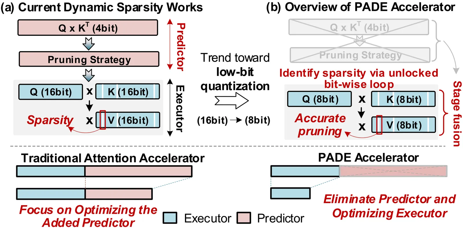 Attention-based models have revolutionized AI, but the quadratic cost of self-attention incurs severe computational and memory overhead. Sparse attention methods alleviate this by skipping low-relevance token pairs. However, current approaches lack practicality due to the heavy expense of added sparsity predictor, which severely drops their hardware efficiency. This paper advances the state-of-the-art (SOTA) by proposing a bit-serial enable stage-fusion (BSF) mechanism, which eliminates the need for a separate predictor. However, it faces key challenges: 1) Inaccurate bit-sliced sparsity speculation leads to incorrect pruning; 2) Hardware under-utilization due to fine-grained and imbalanced bit-level workloads. 3) Tiling difficulty caused by the row-wise dependency in sparsity pruning criteria. We propose PADE, a predictor-free algorithm-hardware co-design for dynamic sparse attention acceleration. PADE features three key innovations: 1) Bit-wise uncertainty interval-enabled guard filtering (BUI-GF) strategy to accurately identify trivial tokens during each bit round; 2) Bidirectional sparsity-based out-of-order execution (BS-OOE) to improve hardware utilization; 3) Interleaving-based sparsity-tiled attention (ISTA) to reduce both I/O and computational complexity. These techniques, combined with custom accelerator designs, enable practical sparsity acceleration without relying on an added sparsity predictor. Extensive experiments on 22 benchmarks show that PADE achieves 7.43x speed up and 31.1x higher energy efficiency than Nvidia H100 GPU. Compared to SOTA accelerators, PADE achieves 5.1x, 4.3x and 3.4x energy saving than Sanger, DOTA and SOFA.