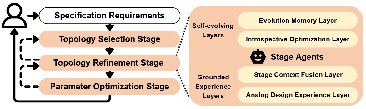 Analog circuit design remains a knowledge- and experience-intensive process that relies heavily on human intuition for topology generation and device parameter tuning. Existing LLM-based approaches typically depend on prompt-driven netlist generation or predefined topology templates, limiting their ability to satisfy complex specification requirements. We propose AnalogSAGE, an open-source self-evolving multi-agent framework that coordinates three-stage agent explorations through four stratified memory layers, enabling iterative refinement with simulation-grounded feedback. To support reproducibility and generality, we release the source code. Our benchmark spans ten specification-driven operational amplifier design problems of varying difficulty, enabling quantitative and cross-task comparison under identical conditions. Evaluated under the open-source SKY130 PDK with ngspice, AnalogSAGE achieves a 10$\times$ overall pass rate, a 48$\times$ Pass@1, and a 4$\times$ reduction in parameter search space compared with existing frameworks, demonstrating that stratified memory and grounded reasoning substantially enhance the reliability and autonomy of analog design automation in practice.