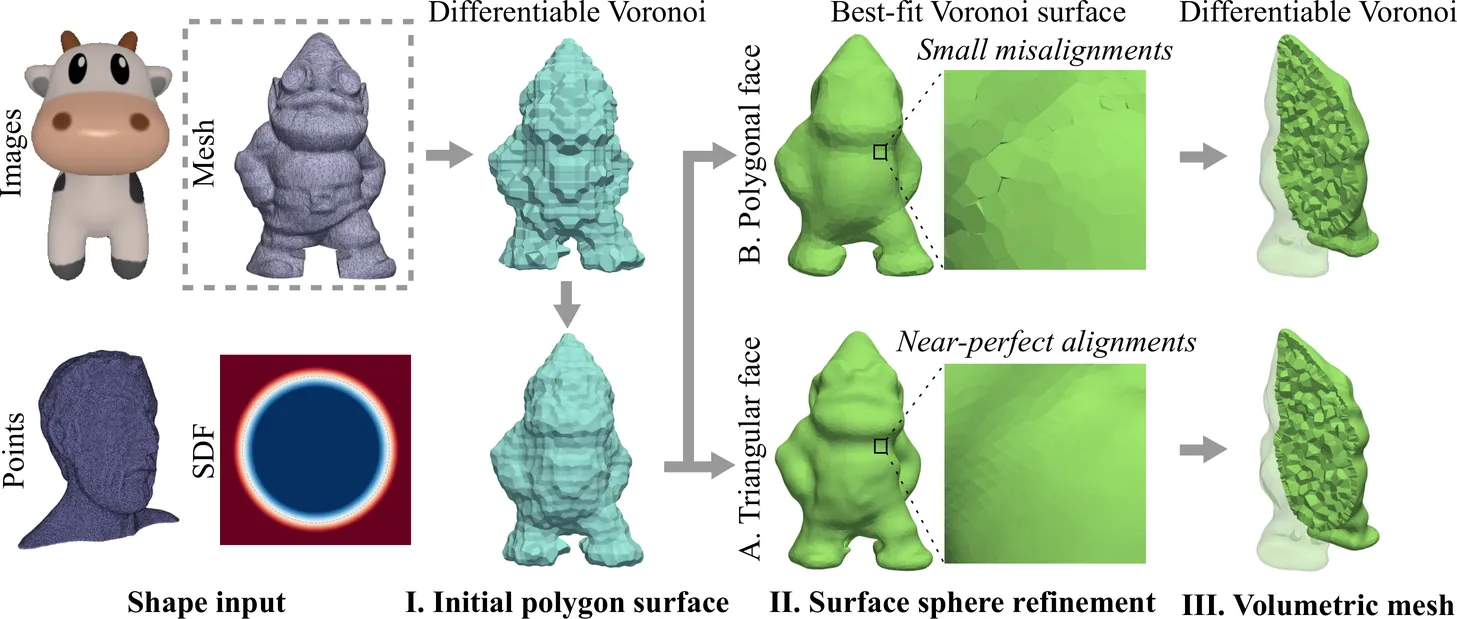 We present VoroLight, a differentiable framework for 3D shape reconstruction based on Voronoi meshing. Our approach generates smooth, watertight surfaces and topologically consistent volumetric meshes directly from diverse inputs, including images, implicit shape level-set fields, point clouds and meshes. VoroLight operates in three stages: it first initializes a surface using a differentiable Voronoi formulation, then refines surface quality through a polygon-face sphere training stage, and finally reuses the differentiable Voronoi formulation for volumetric optimization with additional interior generator points. Project page: https://jiayinlu19960224.github.io/vorolight/
