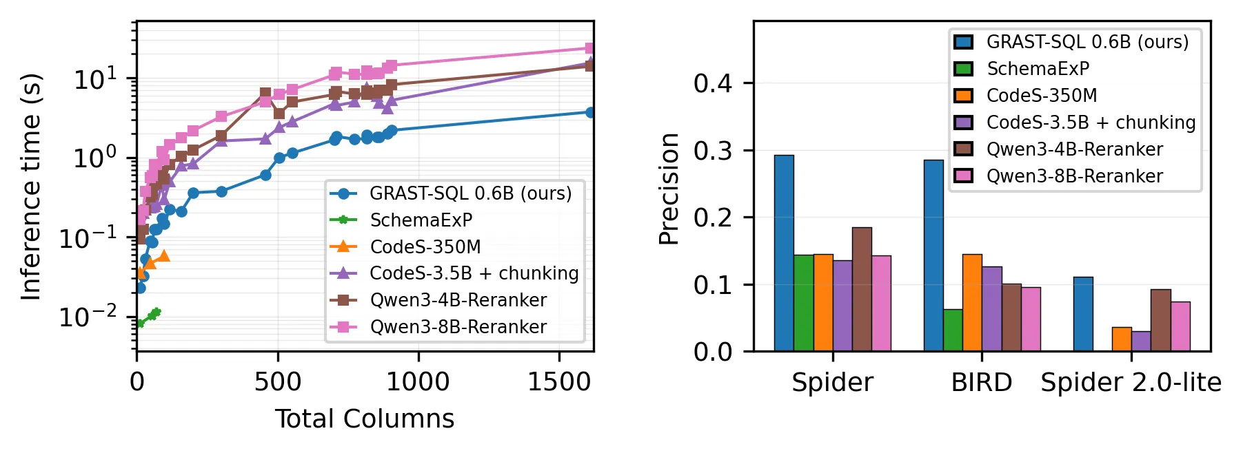 Most modern Text2SQL systems prompt large language models (LLMs) with entire schemas -- mostly column information -- alongside the user's question. While effective on small databases, this approach fails on real-world schemas that exceed LLM context limits, even for commercial models. The recent Spider 2.0 benchmark exemplifies this with hundreds of tables and tens of thousands of columns, where existing systems often break. Current mitigations either rely on costly multi-step prompting pipelines or filter columns by ranking them against user's question independently, ignoring inter-column structure. To scale existing systems, we introduce \toolname, an open-source, LLM-efficient schema filtering framework that compacts Text2SQL prompts by (i) ranking columns with a query-aware LLM encoder enriched with values and metadata, (ii) reranking inter-connected columns via a lightweight graph transformer over functional dependencies, and (iii) selecting a connectivity-preserving sub-schema with a Steiner-tree heuristic. Experiments on real datasets show that \toolname achieves near-perfect recall and higher precision than CodeS, SchemaExP, Qwen rerankers, and embedding retrievers, while maintaining sub-second median latency and scaling to schemas with 23,000+ columns. Our source code is available at https://github.com/thanhdath/grast-sql.