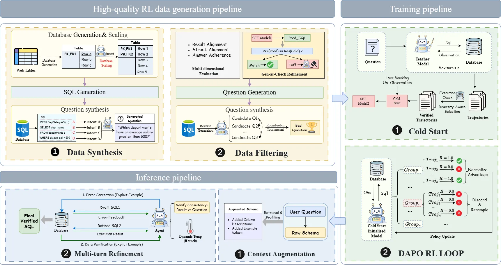 The advancement of Text-to-SQL systems is currently hindered by the scarcity of high-quality training data and the limited reasoning capabilities of models in complex scenarios. In this paper, we propose a holistic framework that addresses these issues through a dual-centric approach. From a Data-Centric perspective, we construct an iterative data factory that synthesizes RL-ready data characterized by high correctness and precise semantic-logic alignment, ensured by strict verification. From a Model-Centric perspective, we introduce a novel Agentic Reinforcement Learning framework. This framework employs a Diversity-Aware Cold Start stage to initialize a robust policy, followed by Group Relative Policy Optimization (GRPO) to refine the agent's reasoning via environmental feedback. Extensive experiments on BIRD and Spider benchmarks demonstrate that our synergistic approach achieves state-of-the-art performance among single-model methods.