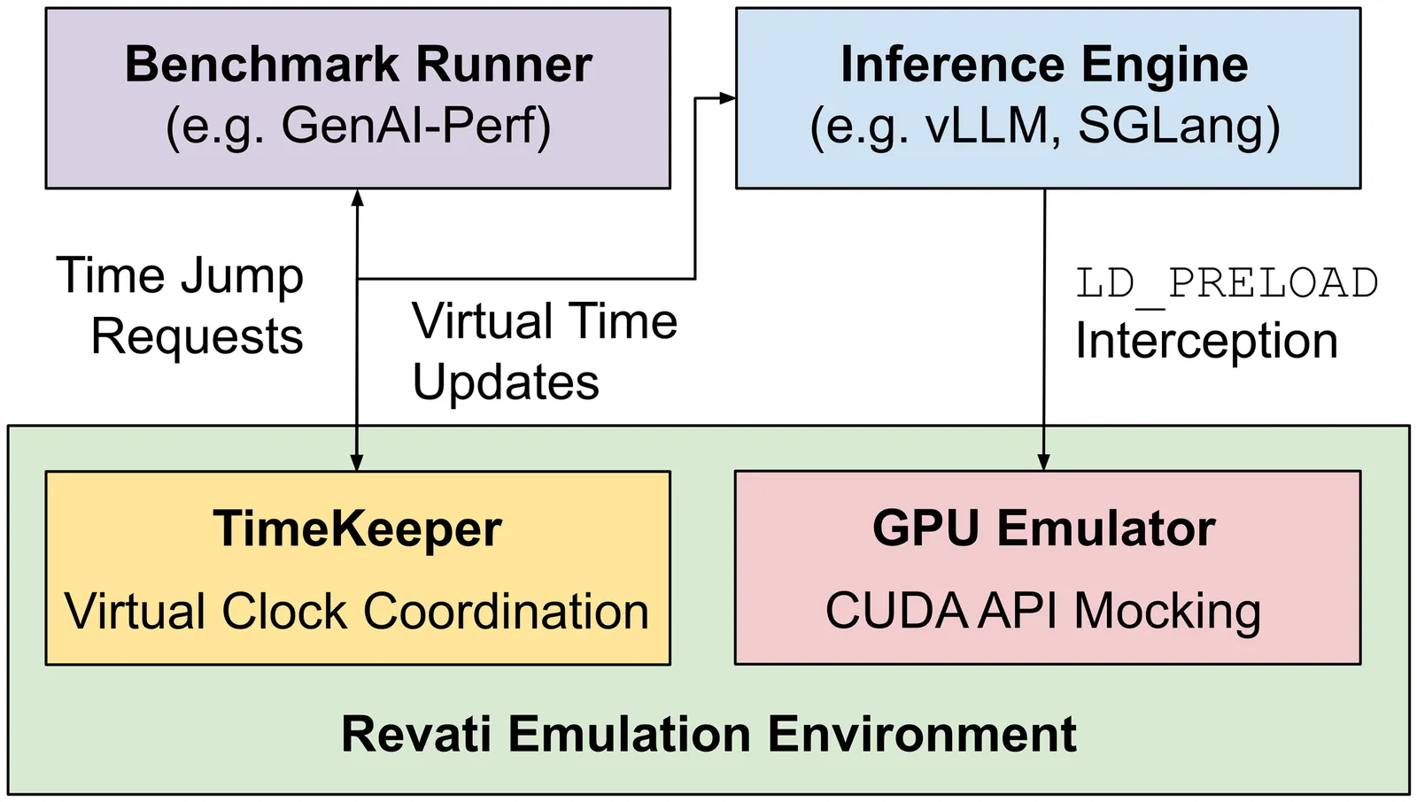 Deploying LLMs efficiently requires testing hundreds of serving configurations, but evaluating each one on a GPU cluster takes hours and costs thousands of dollars. Discrete-event simulators are faster and cheaper, but they require re-implementing the serving system's control logic -- a burden that compounds as frameworks evolve. We present Revati, a time-warp emulator that enables performance modeling by directly executing real serving system code at simulation-like speed. The system intercepts CUDA API calls to virtualize device management, allowing serving frameworks to run without physical GPUs. Instead of executing GPU kernels, it performs time jumps -- fast-forwarding virtual time by predicted kernel durations. We propose a coordination protocol that synchronizes these jumps across distributed processes while preserving causality. On vLLM and SGLang, Revati achieves less than 5% prediction error across multiple models and parallelism configurations, while running 5-17x faster than real GPU execution.