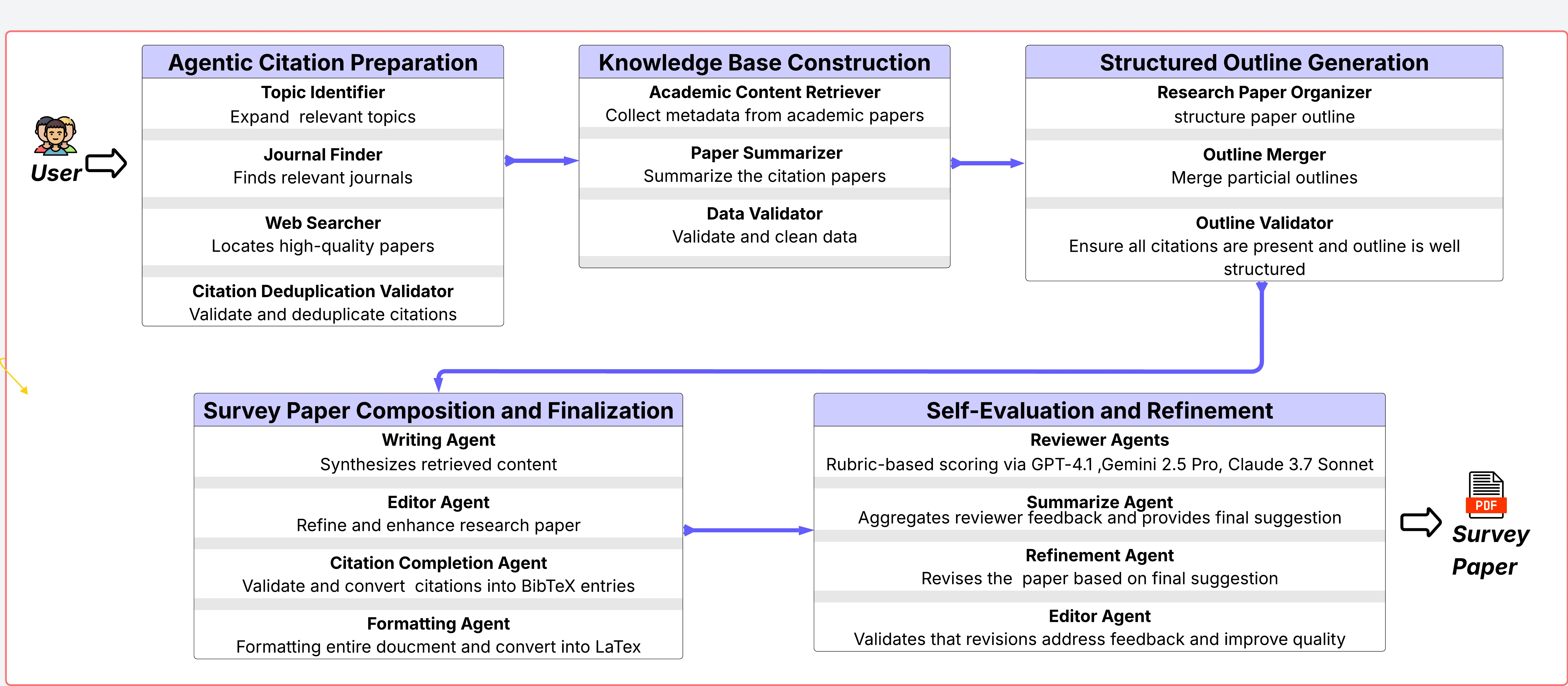 The rapid expansion of scholarly literature presents significant challenges in synthesizing comprehensive, high-quality academic surveys. Recent advancements in agentic systems offer considerable promise for automating tasks that traditionally require human expertise, including literature review, synthesis, and iterative refinement. However, existing automated survey-generation solutions often suffer from inadequate quality control, poor formatting, and limited adaptability to iterative feedback, which are core elements intrinsic to scholarly writing. To address these limitations, we introduce ARISE, an Agentic Rubric-guided Iterative Survey Engine designed for automated generation and continuous refinement of academic survey papers. ARISE employs a modular architecture composed of specialized large language model agents, each mirroring distinct scholarly roles such as topic expansion, citation curation, literature summarization, manuscript drafting, and peer-review-based evaluation. Central to ARISE is a rubric-guided iterative refinement loop in which multiple reviewer agents independently assess manuscript drafts using a structured, behaviorally anchored rubric, systematically enhancing the content through synthesized feedback. Evaluating ARISE against state-of-the-art automated systems and recent human-written surveys, our experimental results demonstrate superior performance, achieving an average rubric-aligned quality score of 92.48. ARISE consistently surpasses baseline methods across metrics of comprehensiveness, accuracy, formatting, and overall scholarly rigor. All code, evaluation rubrics, and generated outputs are provided openly at https://github.com/ziwang11112/ARISE