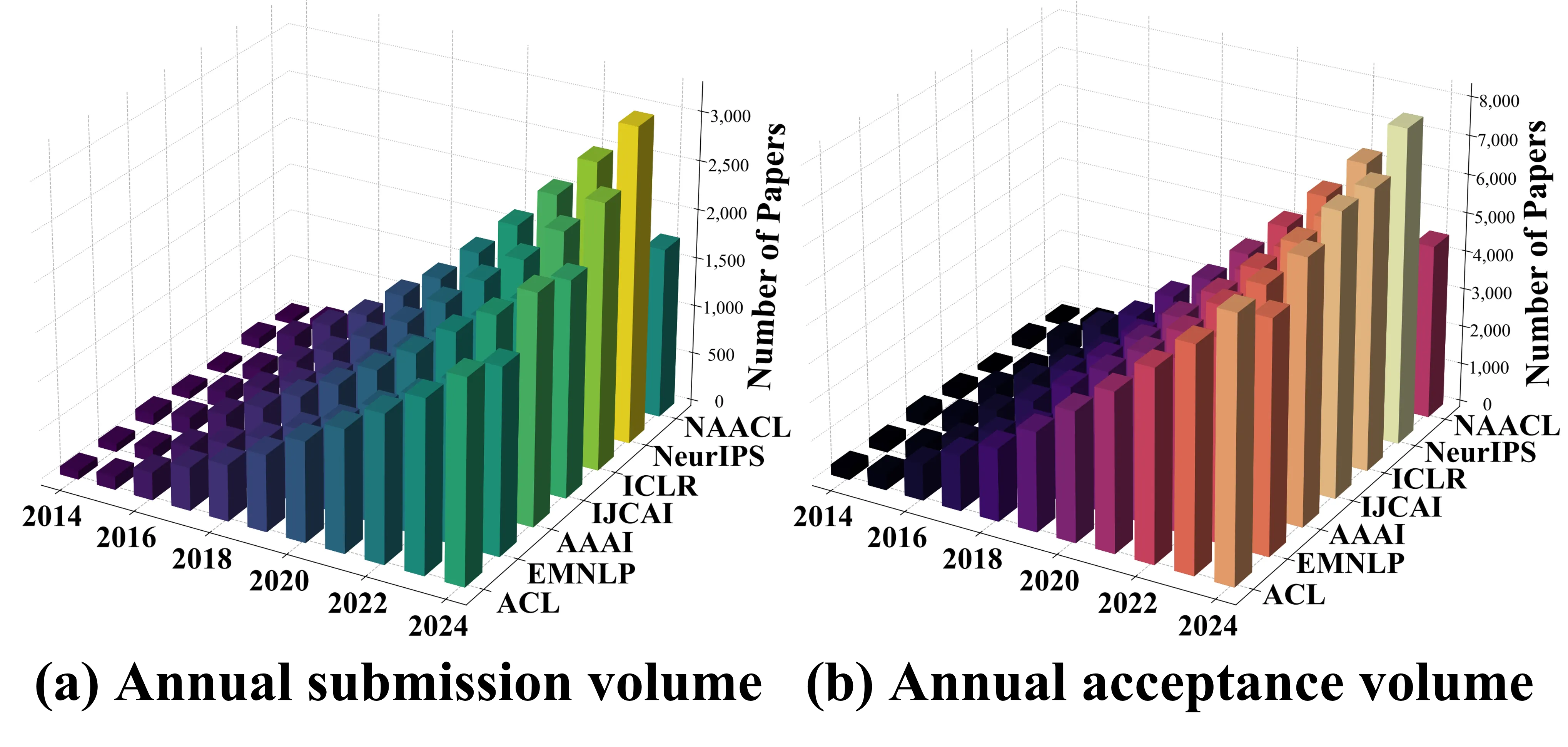 The recent surge of language models has rapidly expanded NLP research, driving an exponential rise in submissions and acceptances at major conferences. Yet this growth has been shadowed by escalating concerns over conference quality, e.g., plagiarism, reviewer inexperience and collusive bidding. However, existing studies rely largely on qualitative accounts (e.g., expert interviews, social media discussions, etc.), lacking longitudinal empirical evidence. To fill this gap, we conduct a ten year empirical study spanning seven leading conferences. We build a four dimensional bibliometric framework covering conference scale, core citation statistics,impact dispersion, cross venue and journal influence, etc. Notably, we further propose a metric Quality Quantity Elasticity, which measures the elasticity of citation growth relative to acceptance growth. Our findings show that ML venues sustain dominant and stable impact, NLP venues undergo widening stratification with mixed expansion efficiency, and AI venues exhibit structural decline. This study provides the first decade-long, cross-venue empirical evidence on the evolution of major conferences.