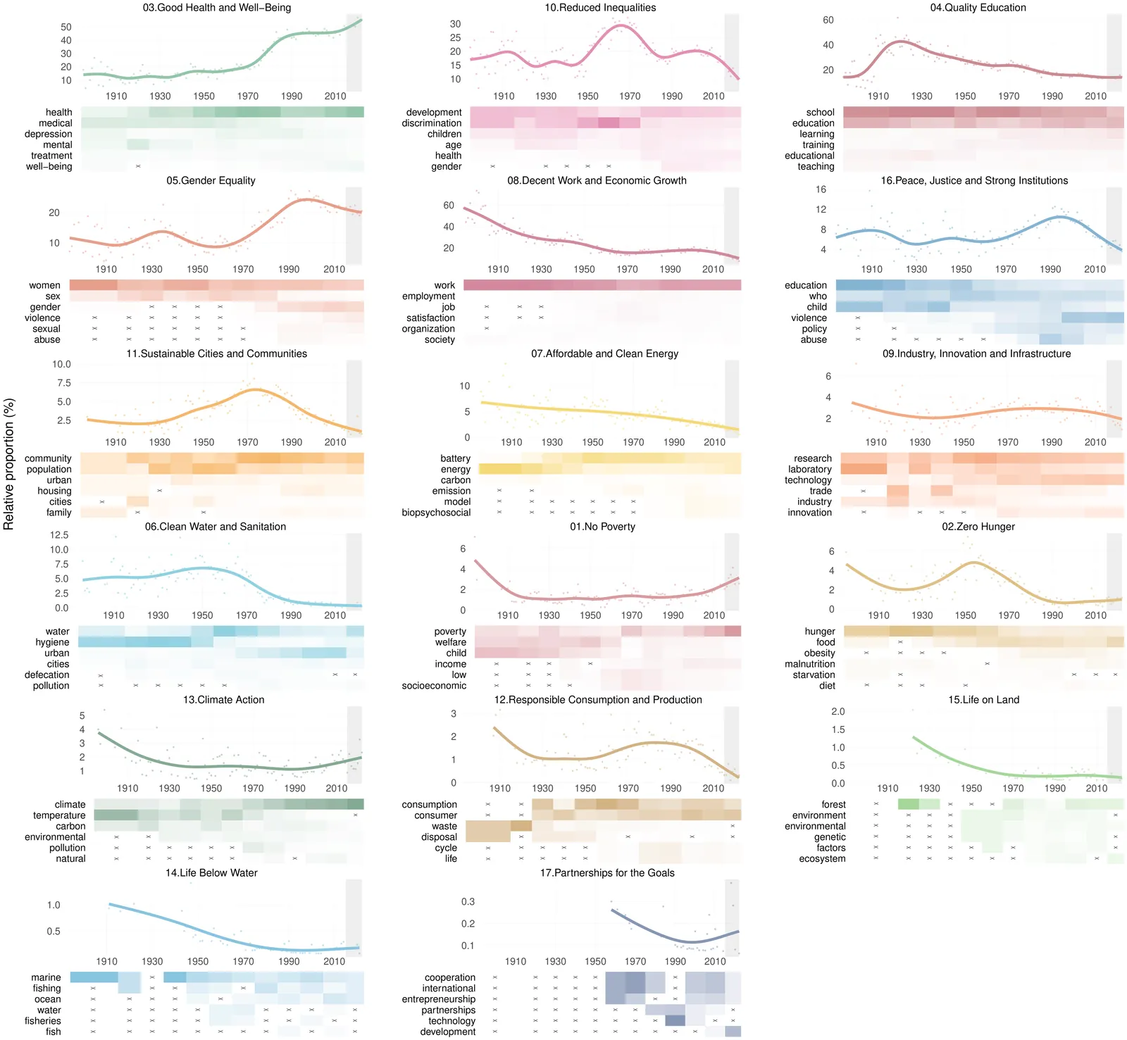 The Sustainable Development Goals (SDGs) offer a lens for tracking societal change, yet contributions from the social and behavioral sciences have rarely been integrated into policy agendas. To take stock and create a baseline and benchmark for the future, we assemble 233,061 psychology publications (1894 -- 2022) and tag them to the 17 SDGs using a query-based classifier. Health, education, work, inequality, and gender dominate the study of SDGs in psychology, shifting from an early focus on work to education and inequality, and since the 1960s, health. United States-based research leads across most goals. Other countries set distinct priorities (e.g., China: education and work; Australia: health). Women comprise about one-third of authors, concentrated in social and health goals, but have been underrepresented in STEM-oriented goals. The 2015 launch of the SDGs marked a turning point: SDG-tagged publications have been receiving more citations than comparable non-SDG work, reversing a pre-2015 deficit. Tracking the SDGs through psychology clarifies long-run engagement with social priorities, identifies evidence gaps, and guides priorities to accelerate the field's contribution to the SDG agenda.