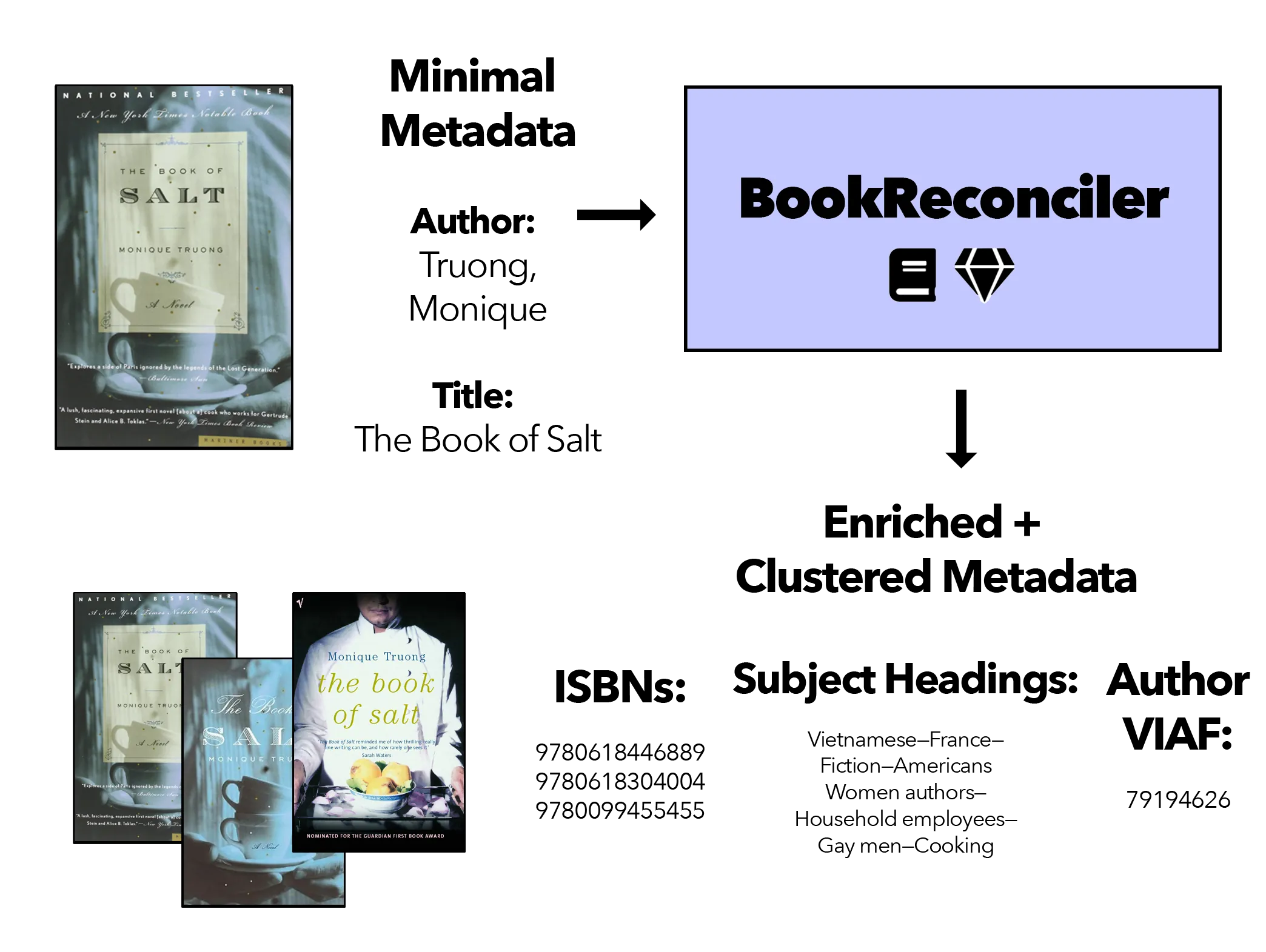 We present BookReconciler, an open-source tool for enhancing and clustering book data. BookReconciler allows users to take spreadsheets with minimal metadata, such as book title and author, and automatically 1) add authoritative, persistent identifiers like ISBNs 2) and cluster related Expressions and Manifestations of the same Work, e.g., different translations or editions. This enhancement makes it easier to combine related collections and analyze books at scale. The tool is currently designed as an extension for OpenRefine -- a popular software application -- and connects to major bibliographic services including the Library of Congress, VIAF, OCLC, HathiTrust, Google Books, and Wikidata. Our approach prioritizes human judgment. Through an interactive interface, users can manually evaluate matches and define the contours of a Work (e.g., to include translations or not). We evaluate reconciliation performance on datasets of U.S. prize-winning books and contemporary world fiction. BookReconciler achieves near-perfect accuracy for U.S. works but lower performance for global texts, reflecting structural weaknesses in bibliographic infrastructures for non-English and global literature. Overall, BookReconciler supports the reuse of bibliographic data across domains and applications, contributing to ongoing work in digital libraries and digital humanities.