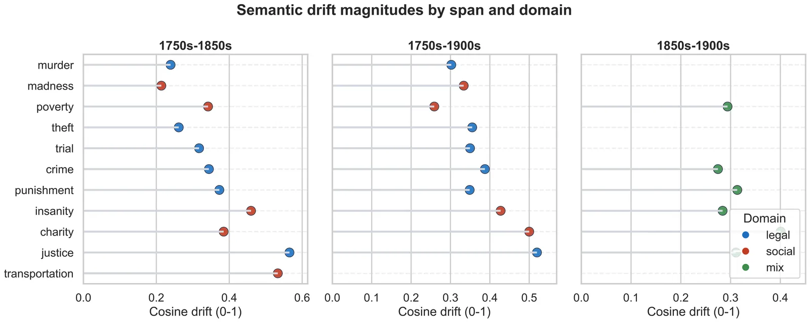 Digital-humanities work on semantic shift often alternates between handcrafted close readings and opaque embedding machinery. We present a reproducible expert-system style pipeline that quantifies and visualises lexical drift in the Old Bailey Corpus (1720--1913), coupling interpretable trajectories with legally meaningful axes. We bin proceedings by decade with dynamic merging for low-resource slices, train skip-gram embeddings, align spaces through orthogonal Procrustes, and measure both geometric displacement and neighborhood turnover. Three visual analytics outputs, which are drift magnitudes, semantic trajectories, and movement along a mercy-versus-retribution axis, expose how justice, crime, poverty, and insanity evolve with penal reforms, transportation debates, and Victorian moral politics. The pipeline is implemented as auditable scripts so results can be reproduced in other historical corpora.